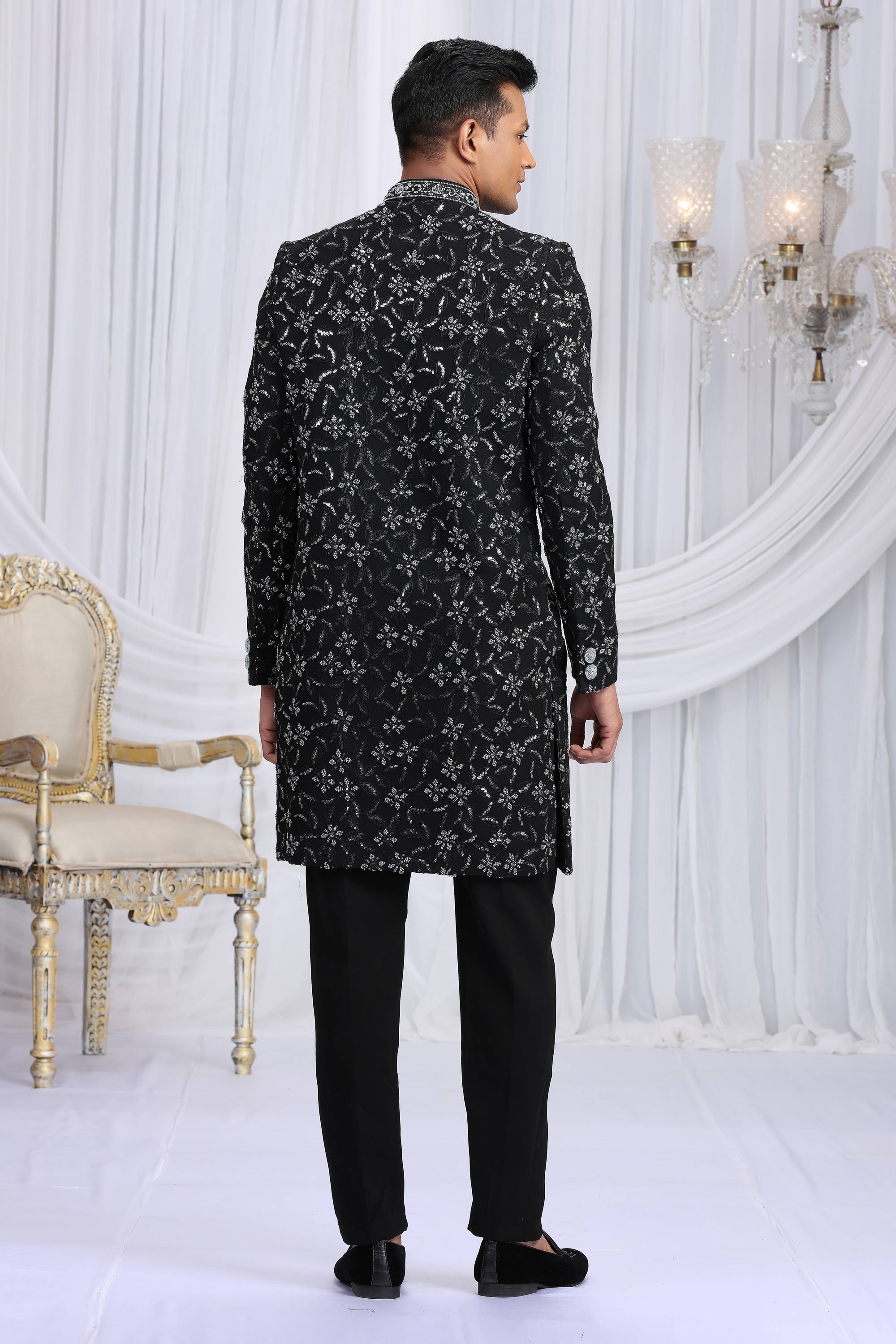 Embroidery Work Black Wedding Wear Indo Western For Men