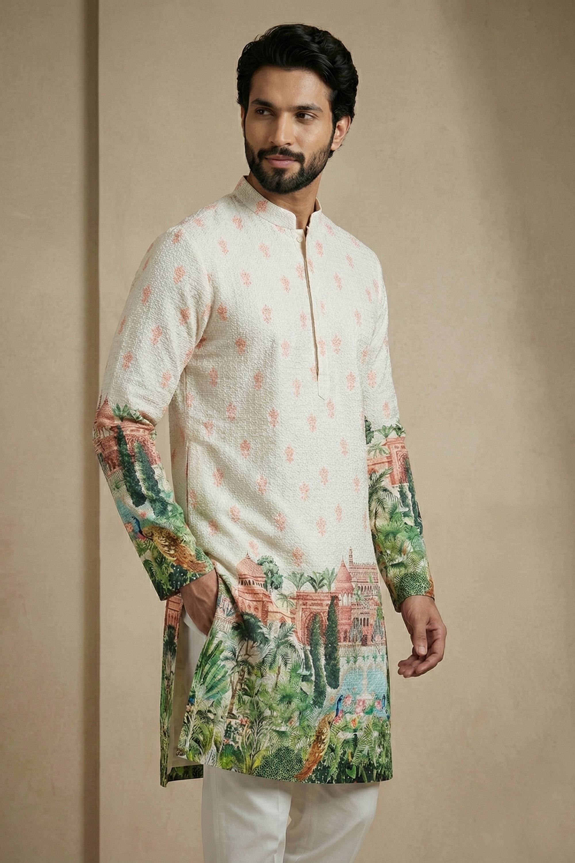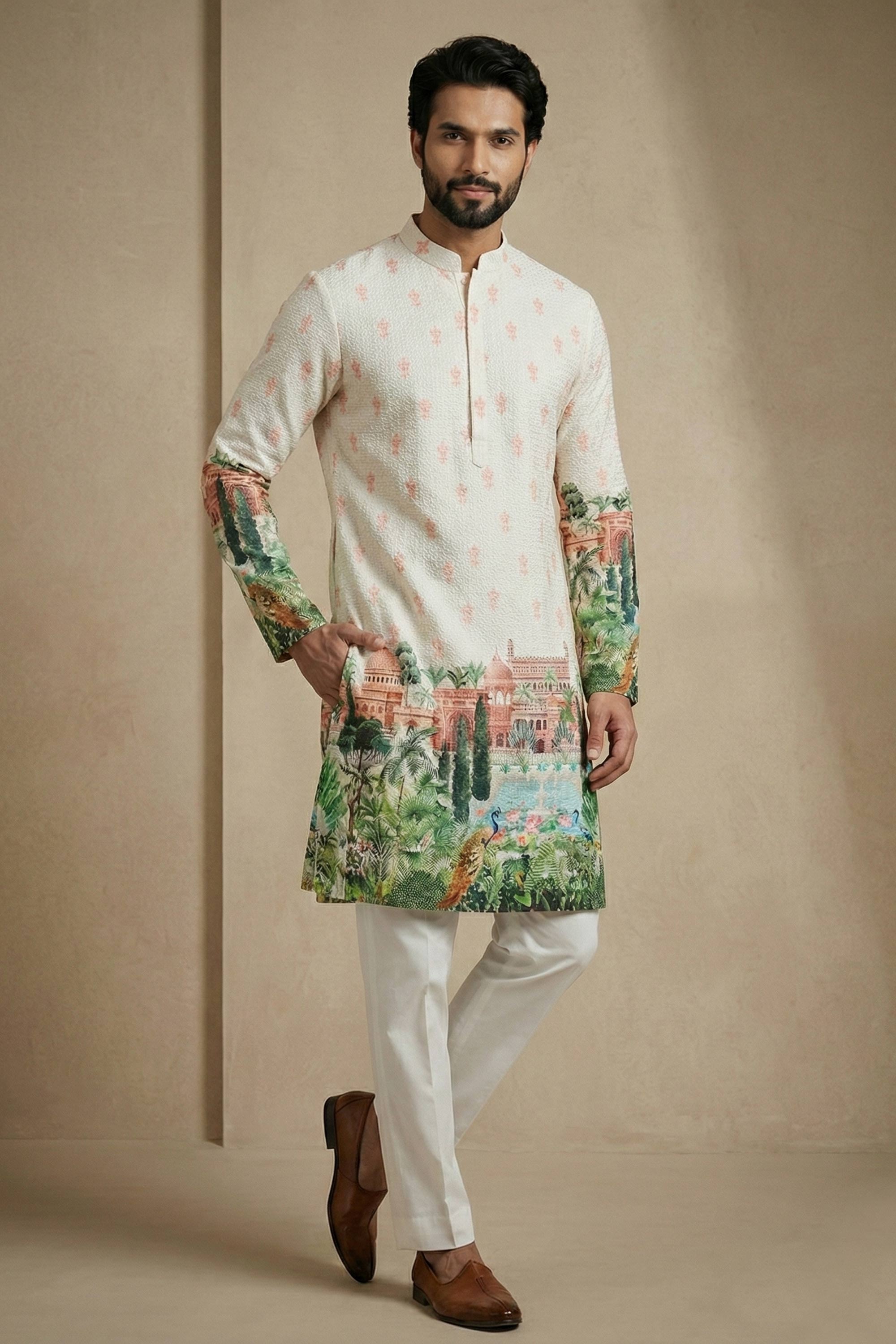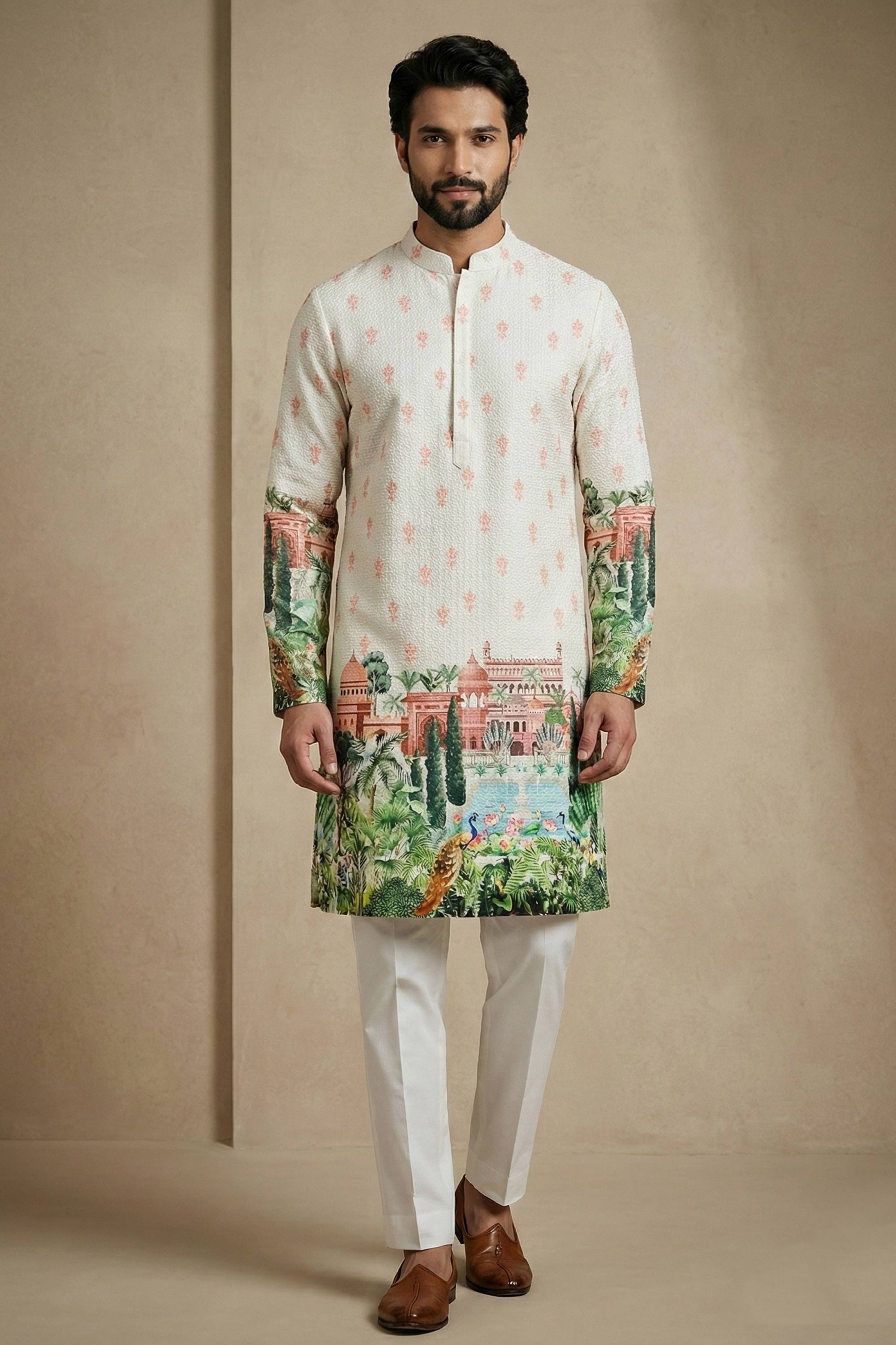 Multi Color Wedding Wear Cotton Printed Readymade Kurta Pyjama For Men