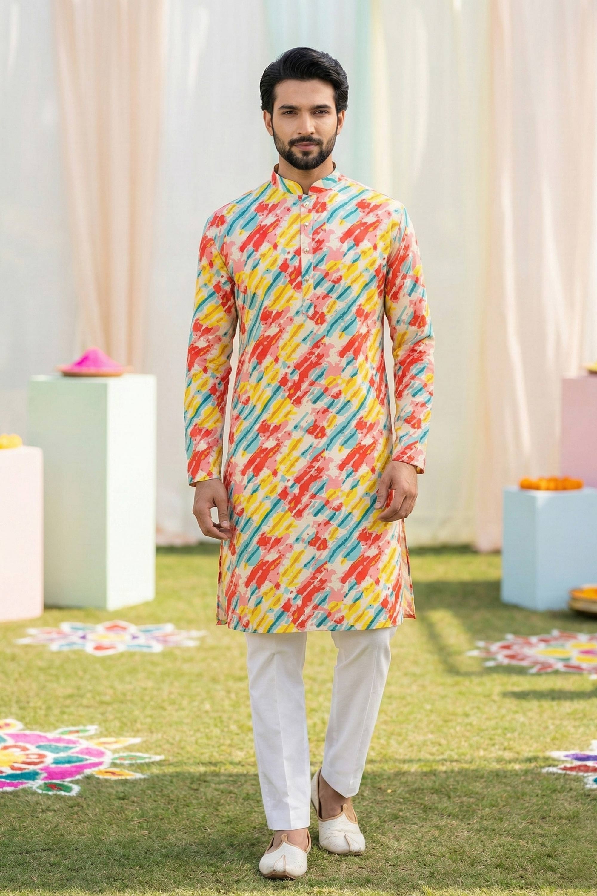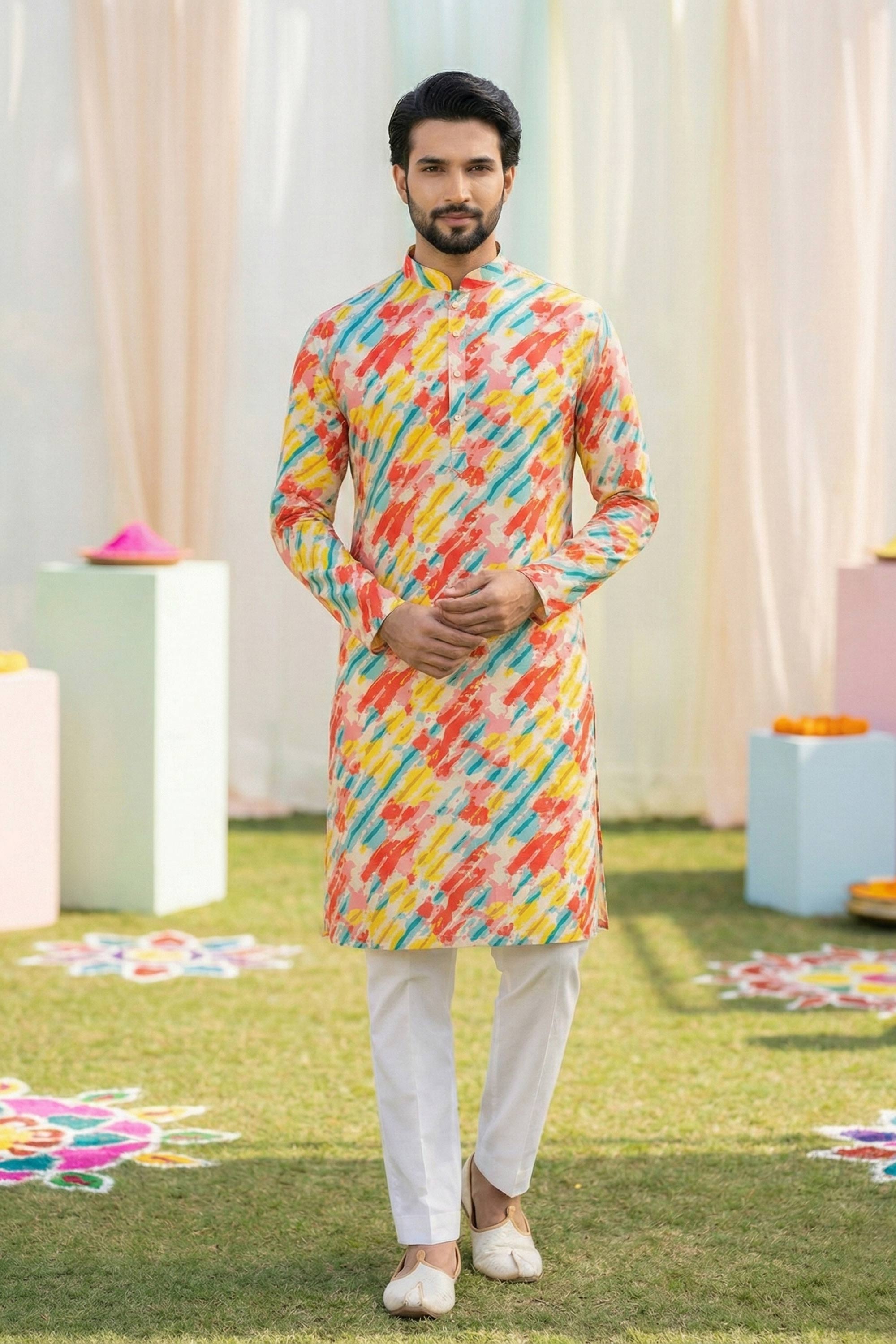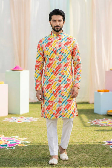 Printed Cotton Fabric Multi Color Readymade Kurta Pyjama For Men
