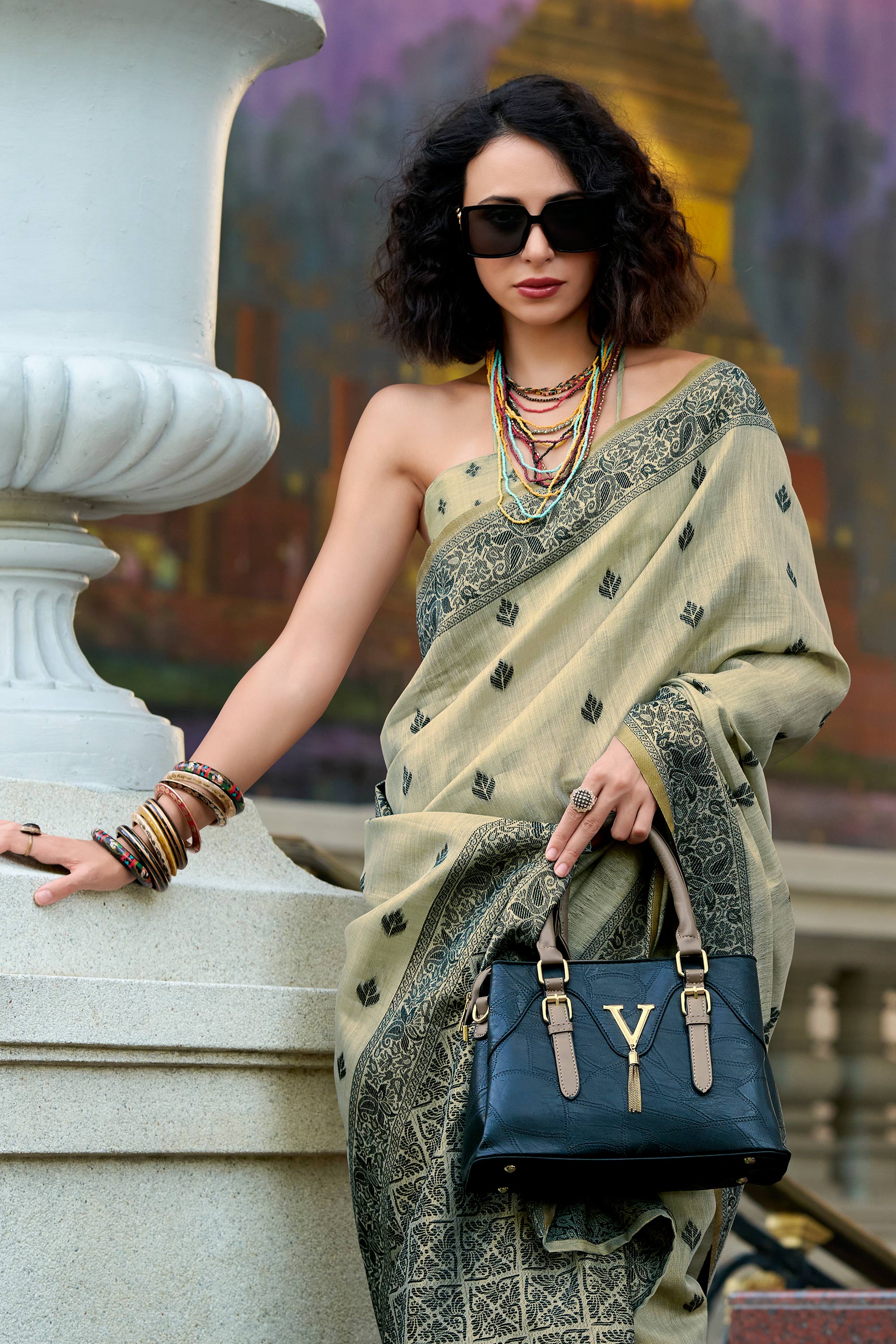 Tissue Fabric Cream Saree For Casual Wear