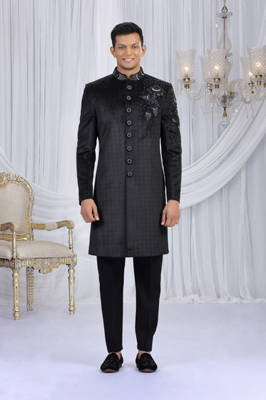 Velvet Fabric Black Wedding Wear Indo Western For Men
