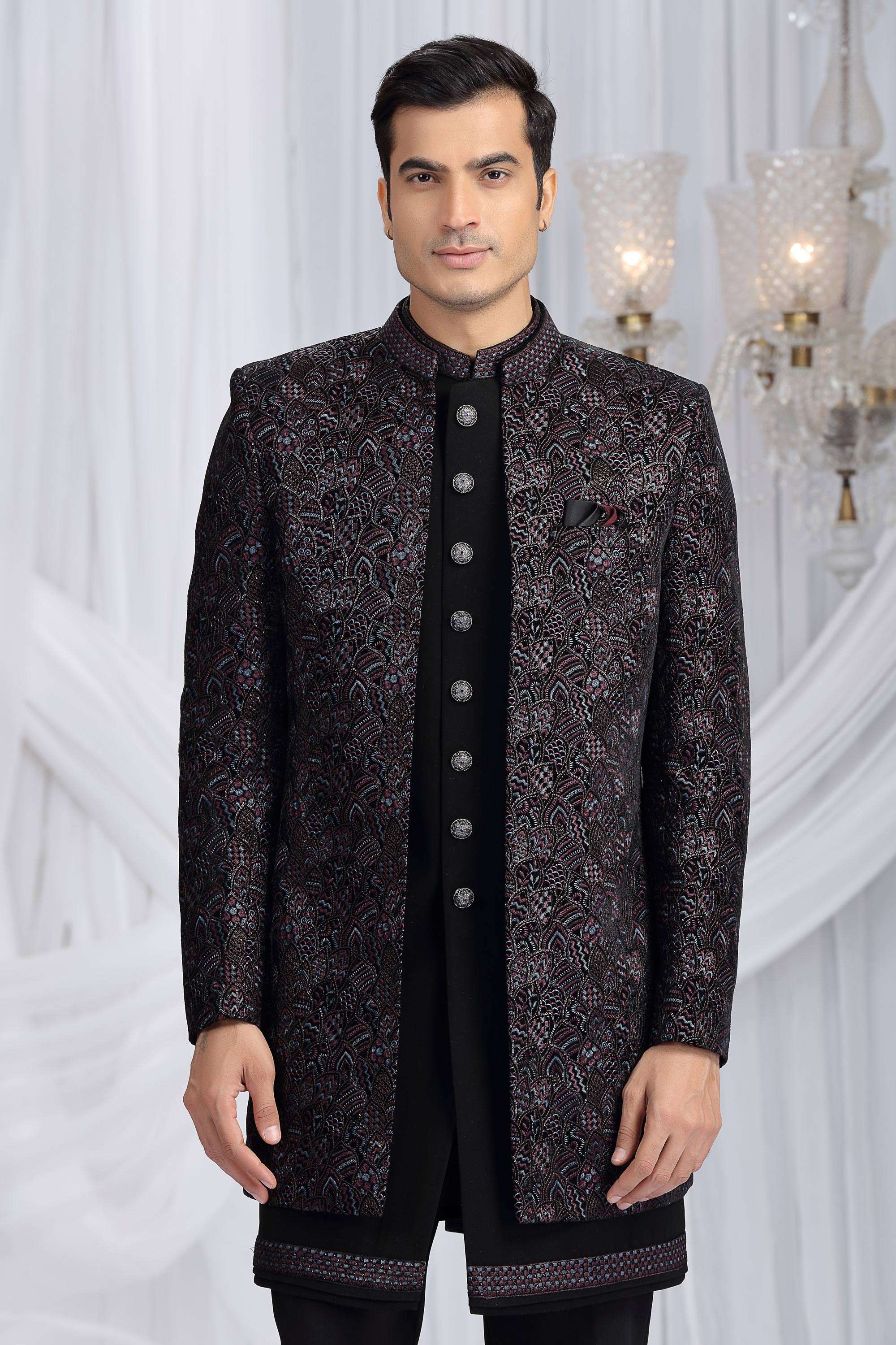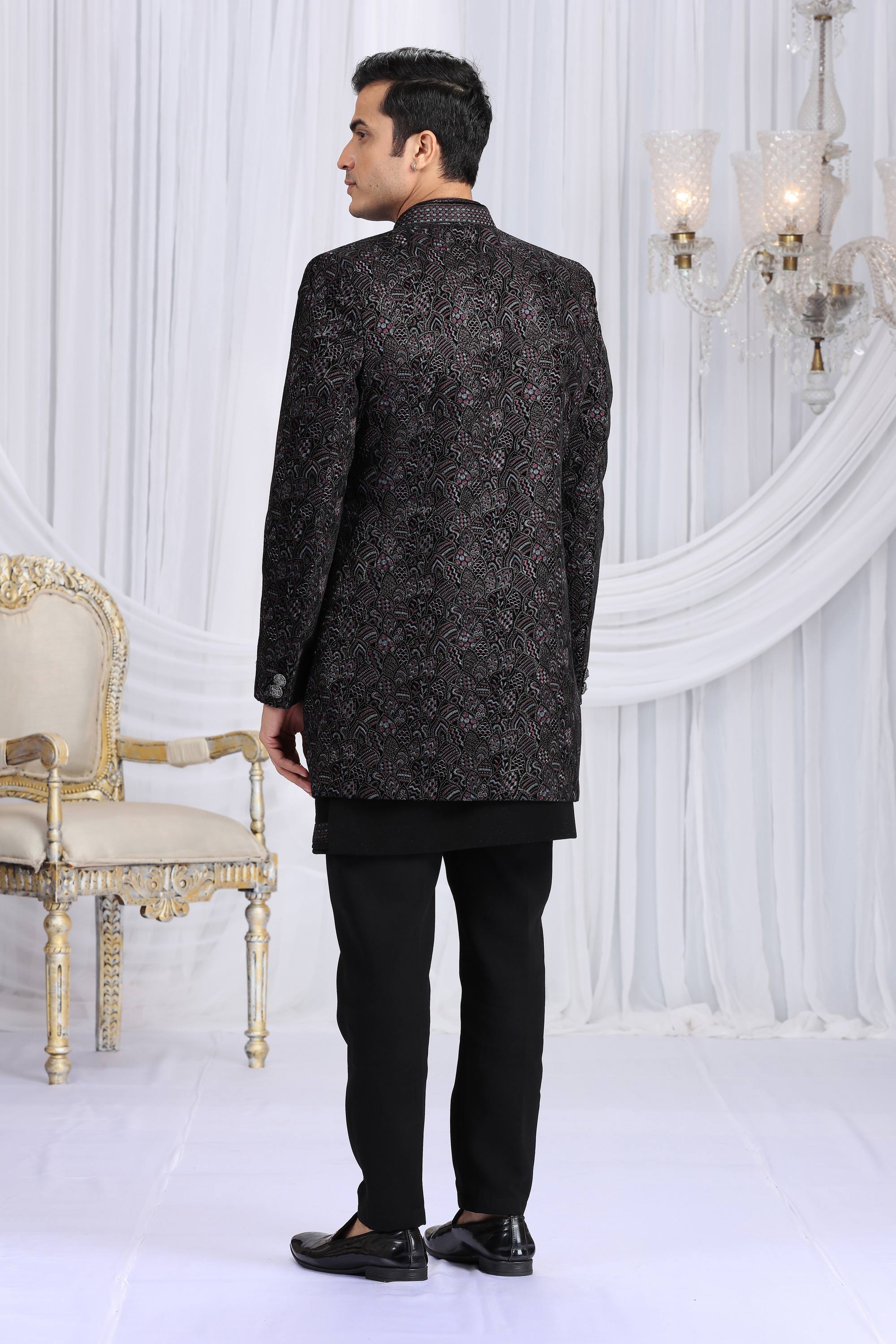 Velvet Silk Fabric Black Wedding Wear Indo Western For Men