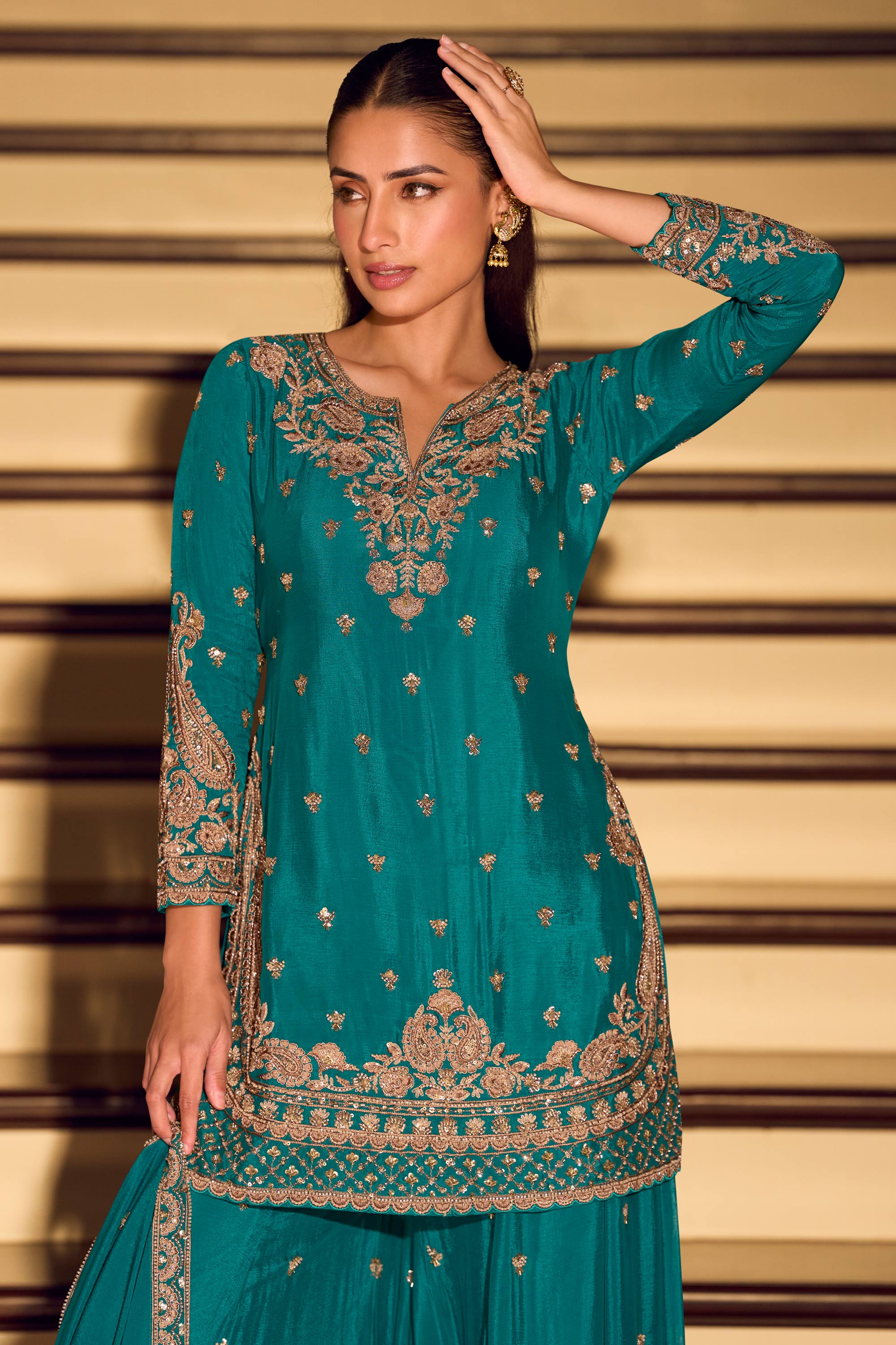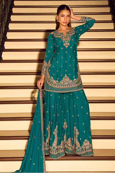 Chinon Silk Embroidered Teal Readymade Palazzo Suit For Sangeet Wear