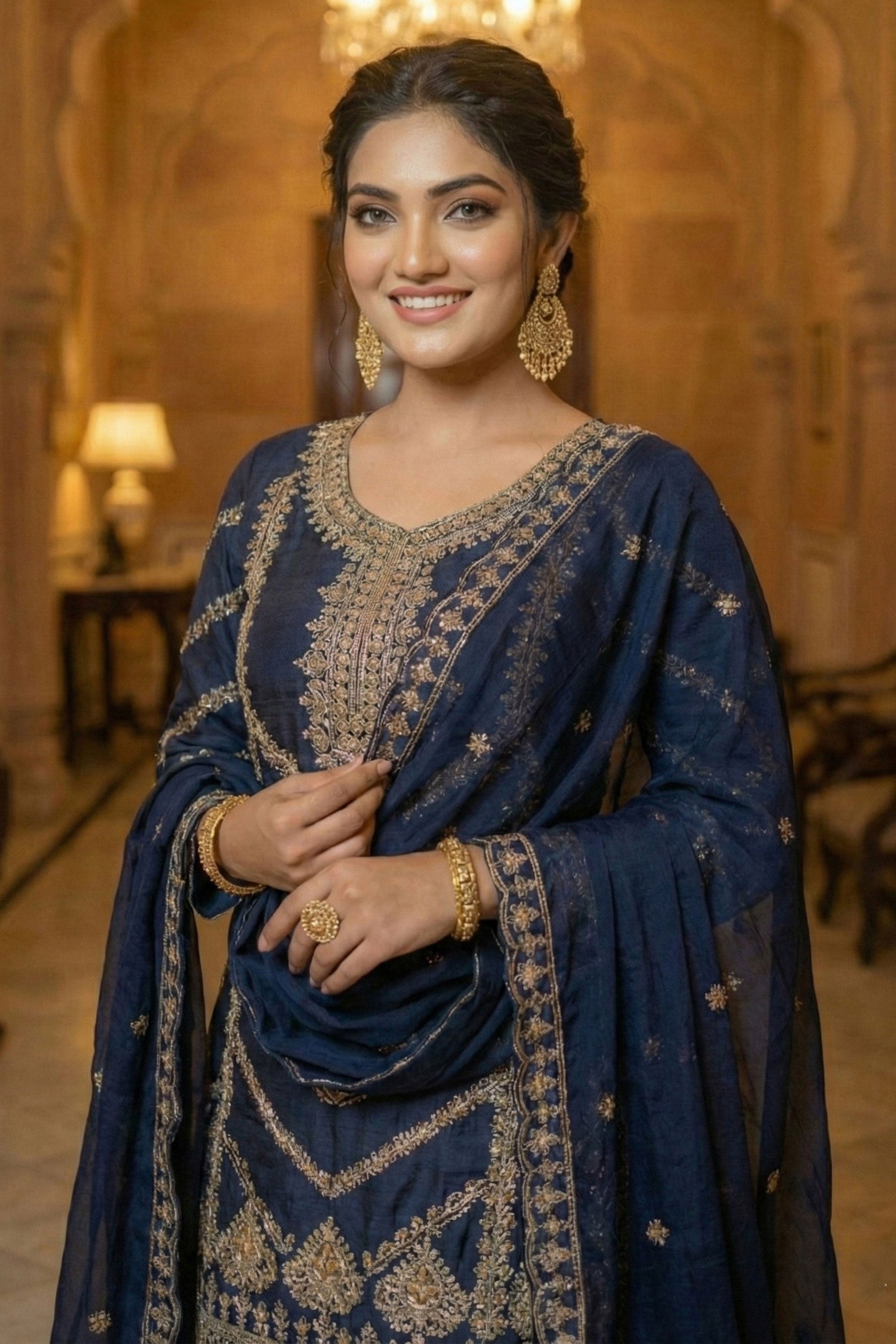Step out in style with this Women’s Blue Embroidered Chinon Readymade Palazzo Suit with Dupatta. Perfect for celebrations and gatherings, the suit features beautiful embroidery on luxurious Chinon fabric, creating a graceful and polished look. The lightweight material and thoughtful design ensure a flattering fit, while the flowy palazzo makes it a breeze to move comfortably throughout the day. Complemented by a beautifully matching dupatta, this outfit balances elegance and convenience for any event. Upgrade your collection with this ready-to-wear set and experience the ease of traditional yet fashionable attire.