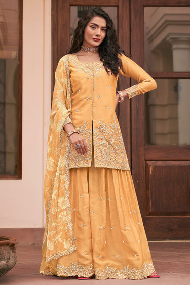 Beautiful Yellow Color Readymade Palazzo Suit In Art Silk Fabric