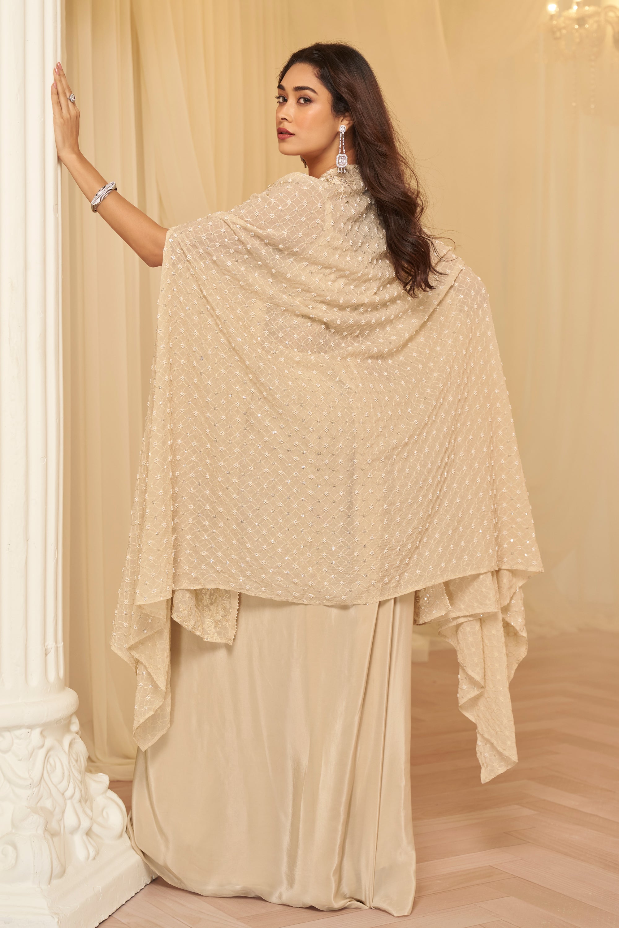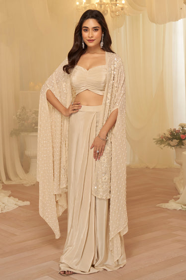 Elegant Georgette Beige Palazzo With Embroidered Crop Top And Stylish Long Jacket