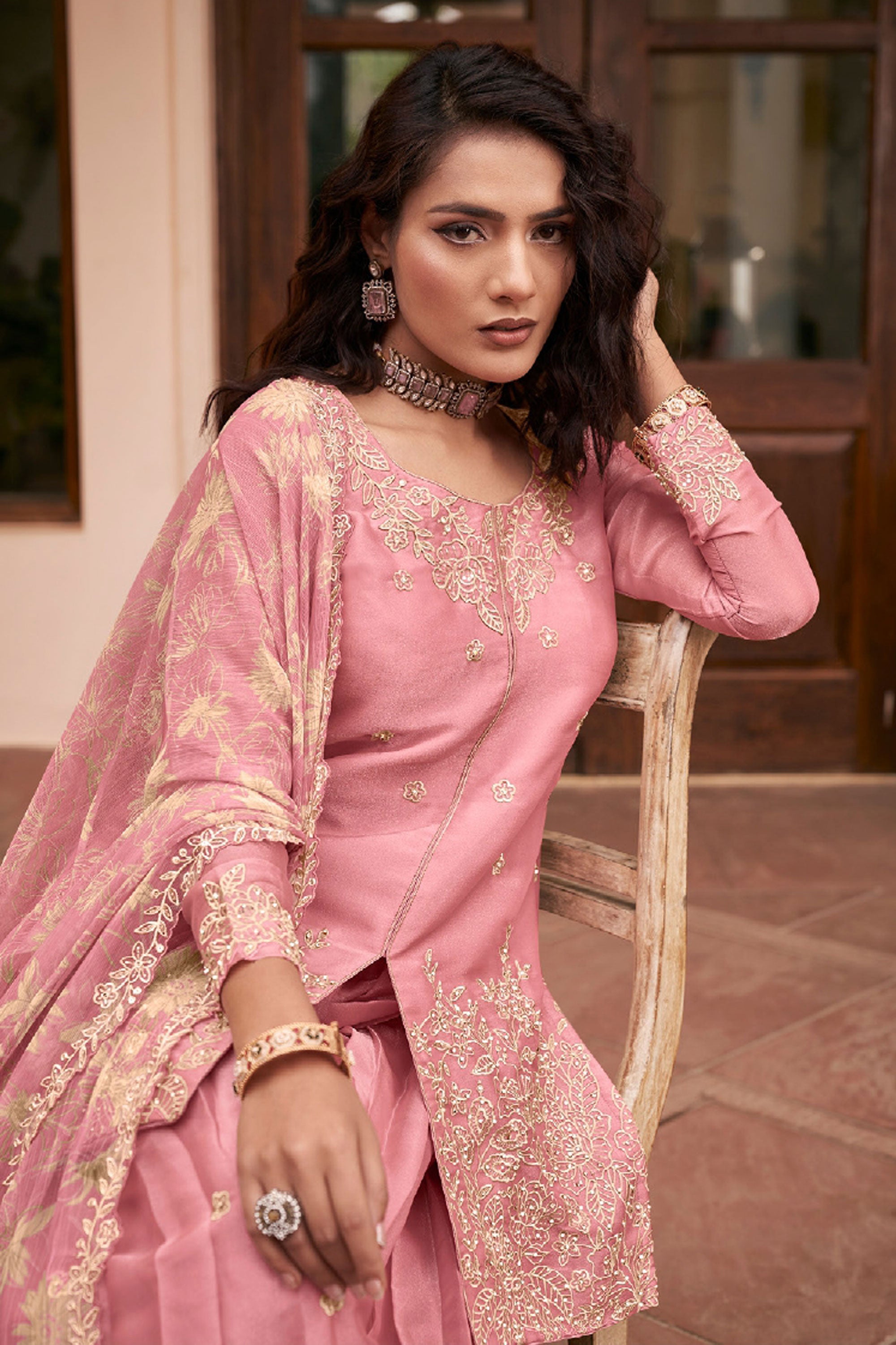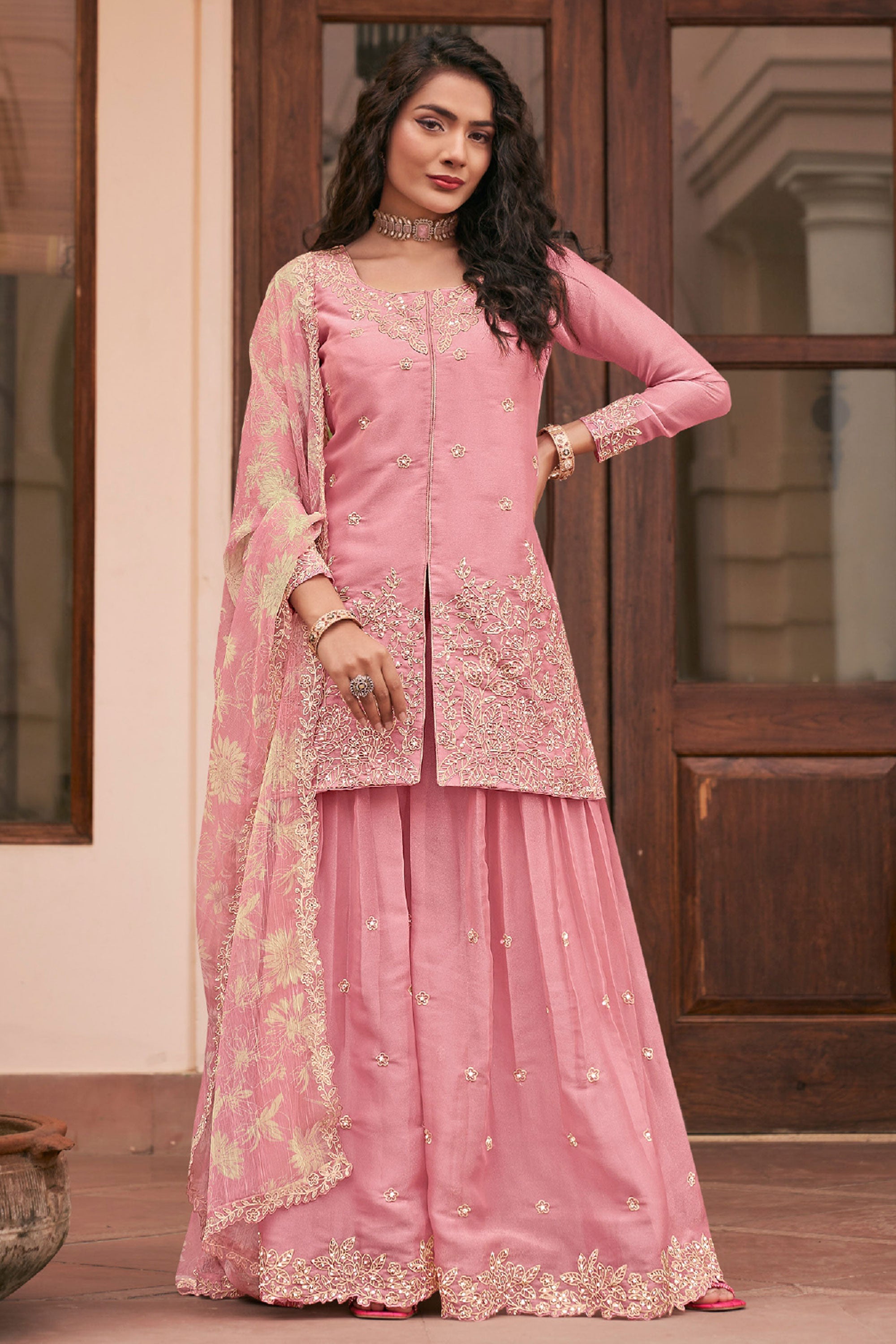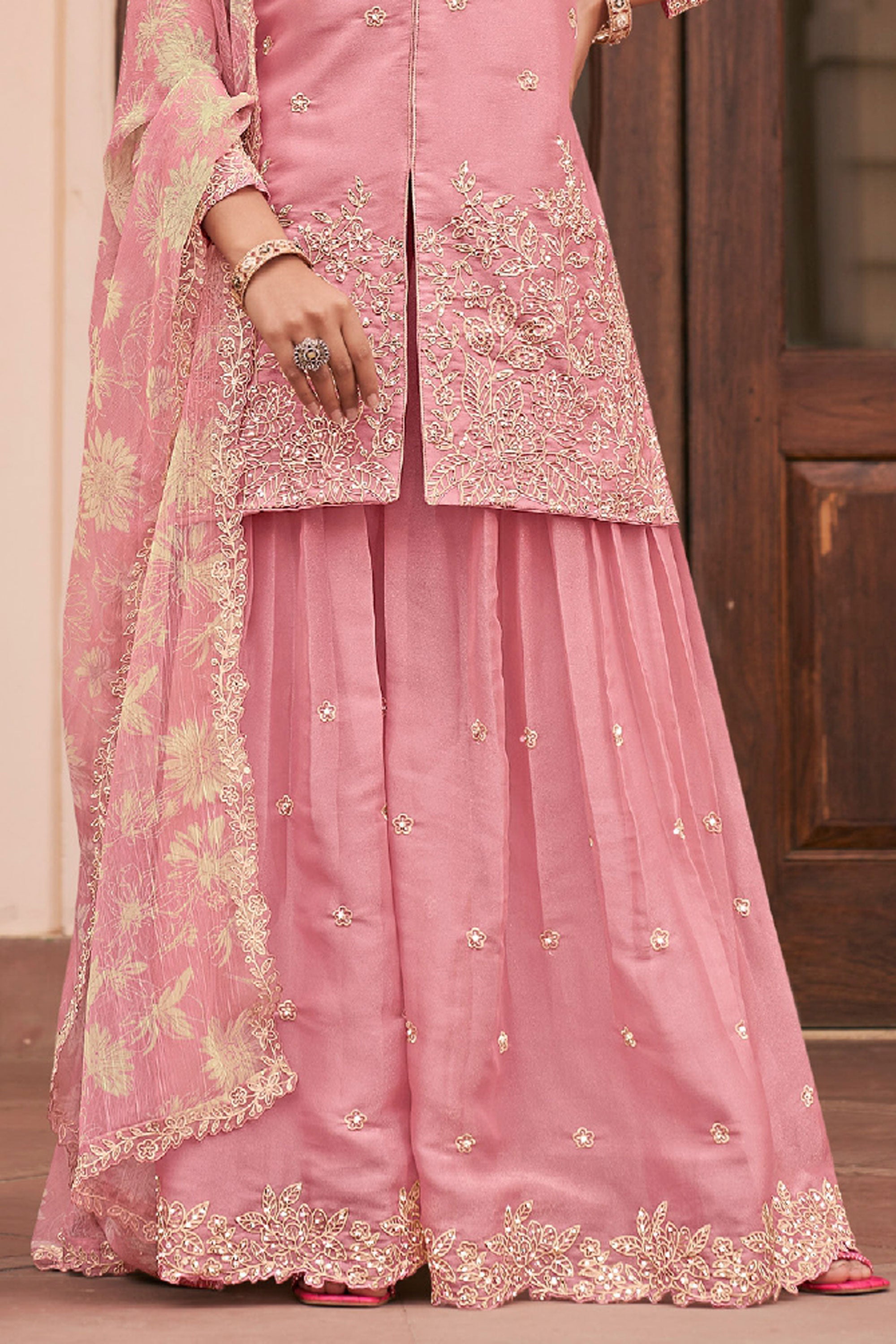 Step into elegance with this stunning Readymade Palazzo Suit, perfect for special functions and festive occasions. The top is crafted from heavy premium MOS silk and beautifully enhanced with intricate heavy embroidery work, giving it a rich and graceful appeal. It is paired with a comfortable heavy premium silk palazzo bottom that adds a stylish flow to the outfit. Completing the look is a heavy premium Bemberg chiffon dupatta featuring elegant digital prints and detailed embroidery work, adding charm and sophistication to the ensemble. Note: Due to digital photography, slight color variations may occur.