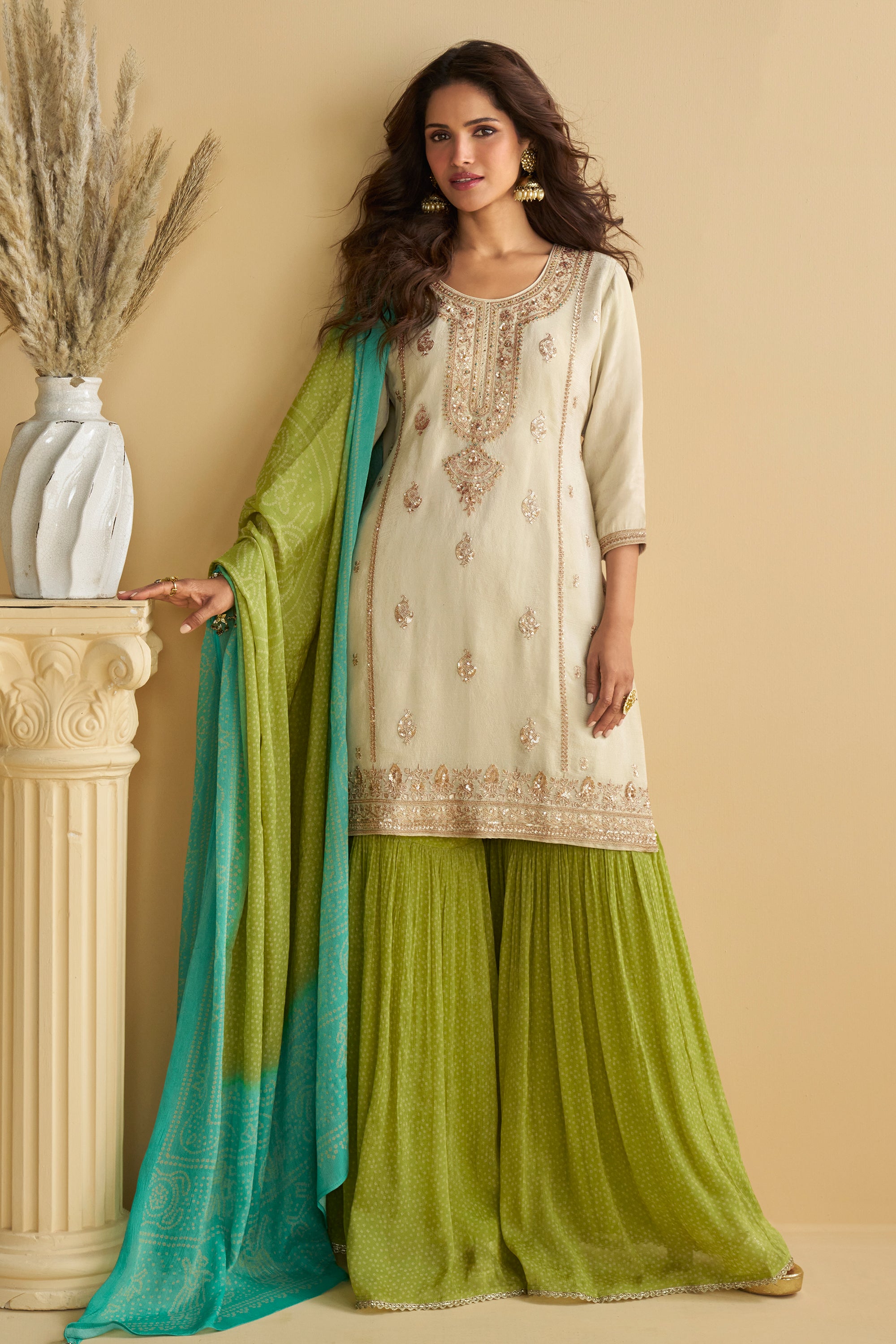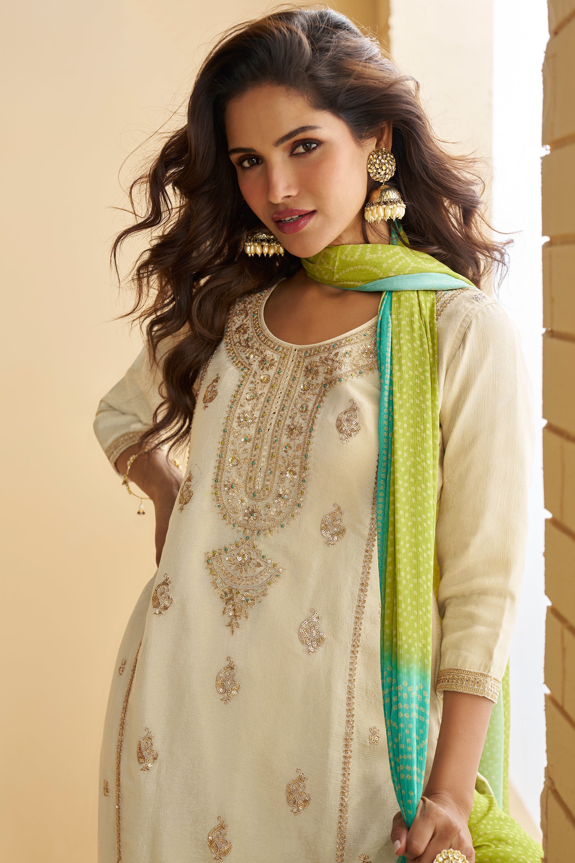 Womens Beige Embroidered Chinon Silk Readymade Palazzo Suit With Dupatta