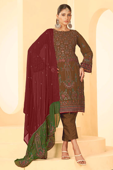 Georgette Fabric Party Style Beatific Pakistani Replica Suit In Brown Color