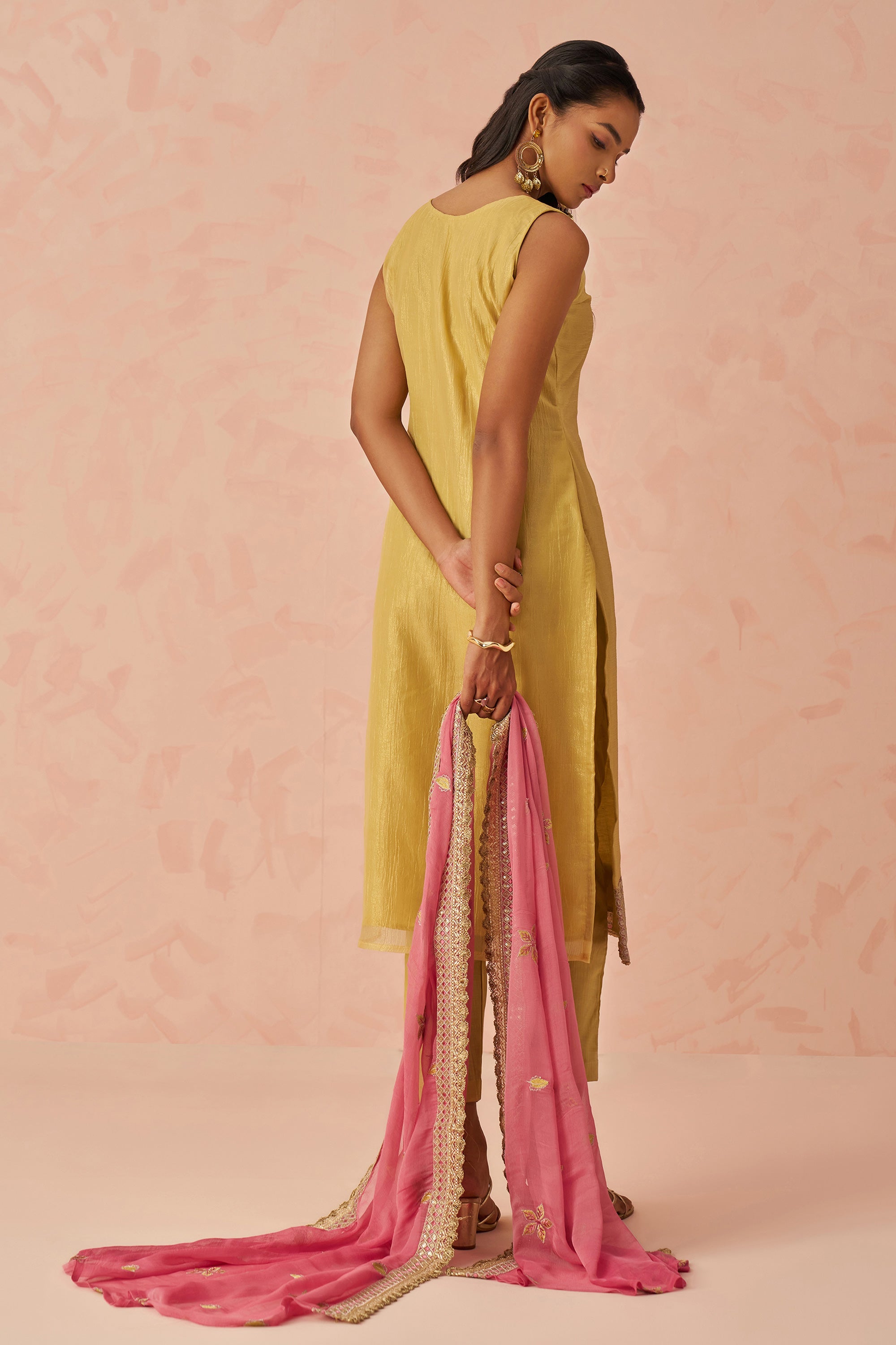 Yellow Designer Fancy Crush Fabric Readymade Straight Cut Suit With Embroidery Work