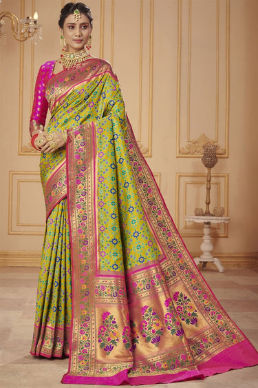 Function Wear Pure Paithani Silk Fabric Green Color Patola Style Saree With Weaving Work