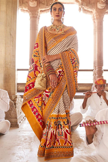 Patola Silk Fabric Printed Function Wear Vivacious Saree With Semi Stitched Blouse In Musatrd Color