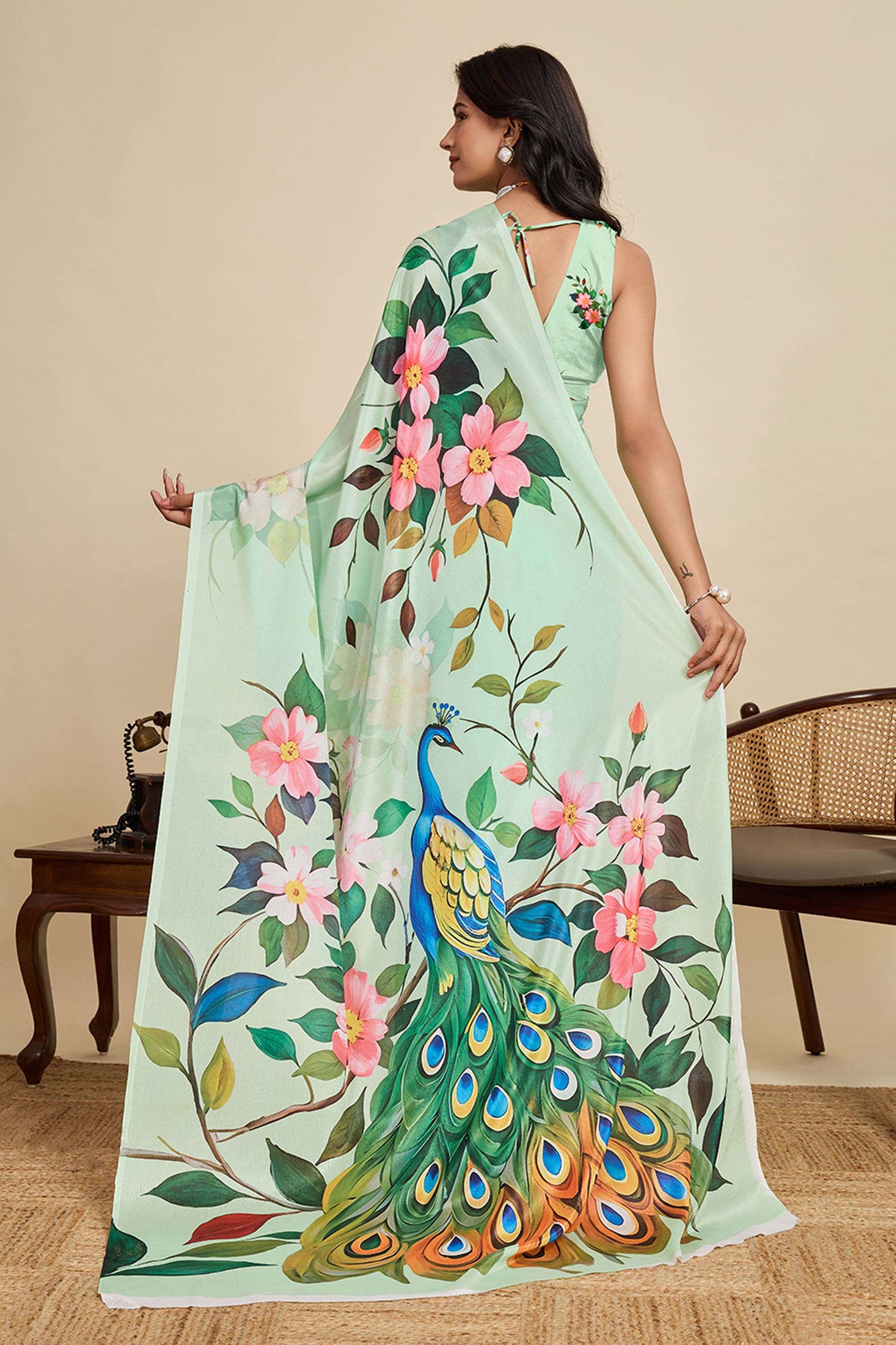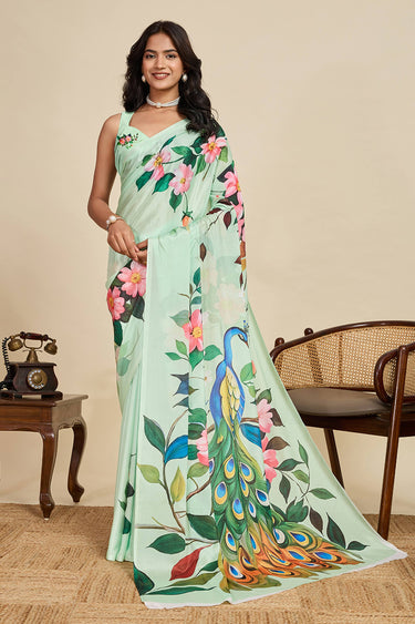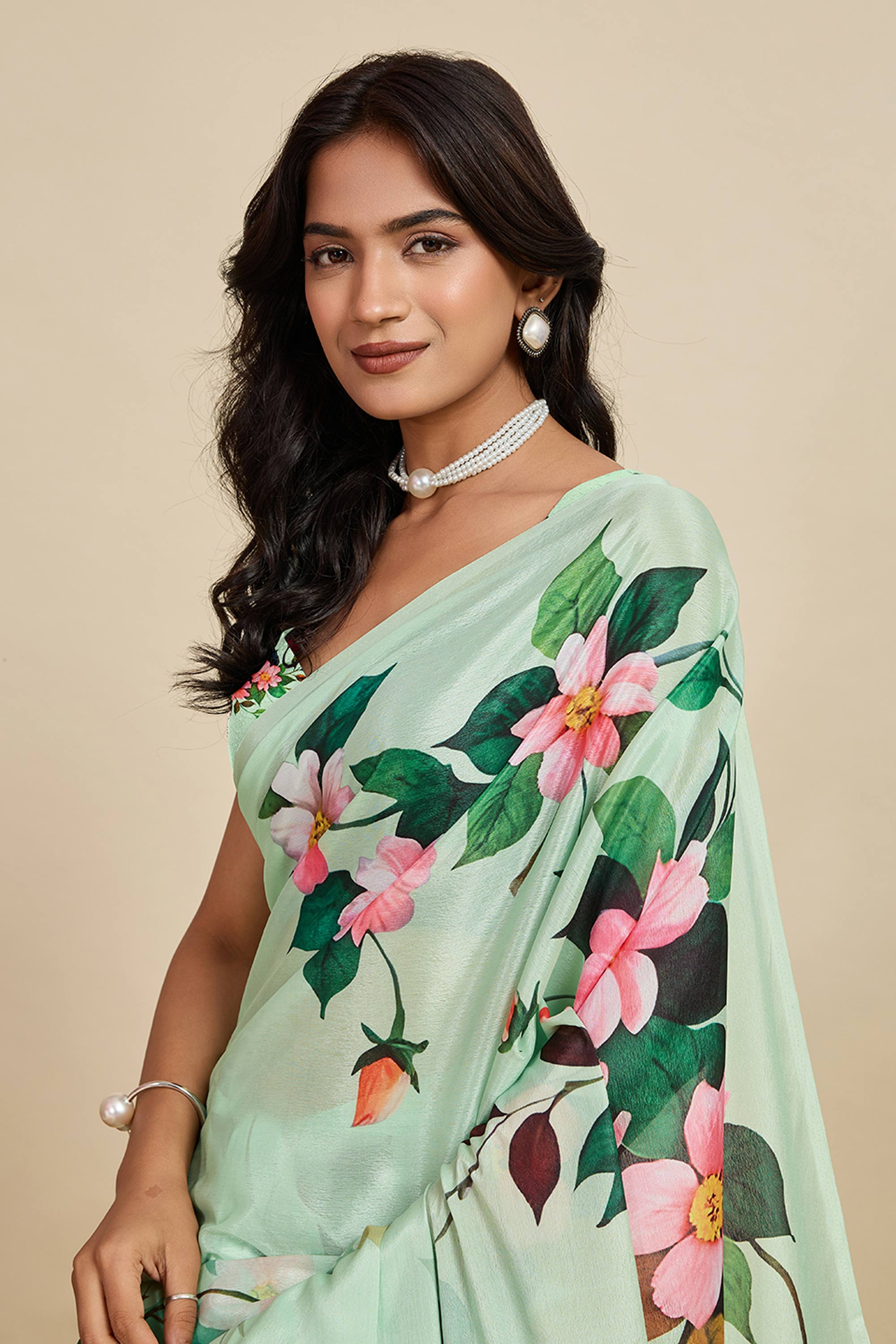 Chinon Digital Printed Sea Green Casual Wear Saree