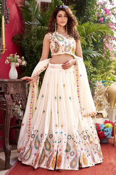 Off White Sangeet Wear Art Silk Embroidered Readymade Lehenga Choli With Dupatta