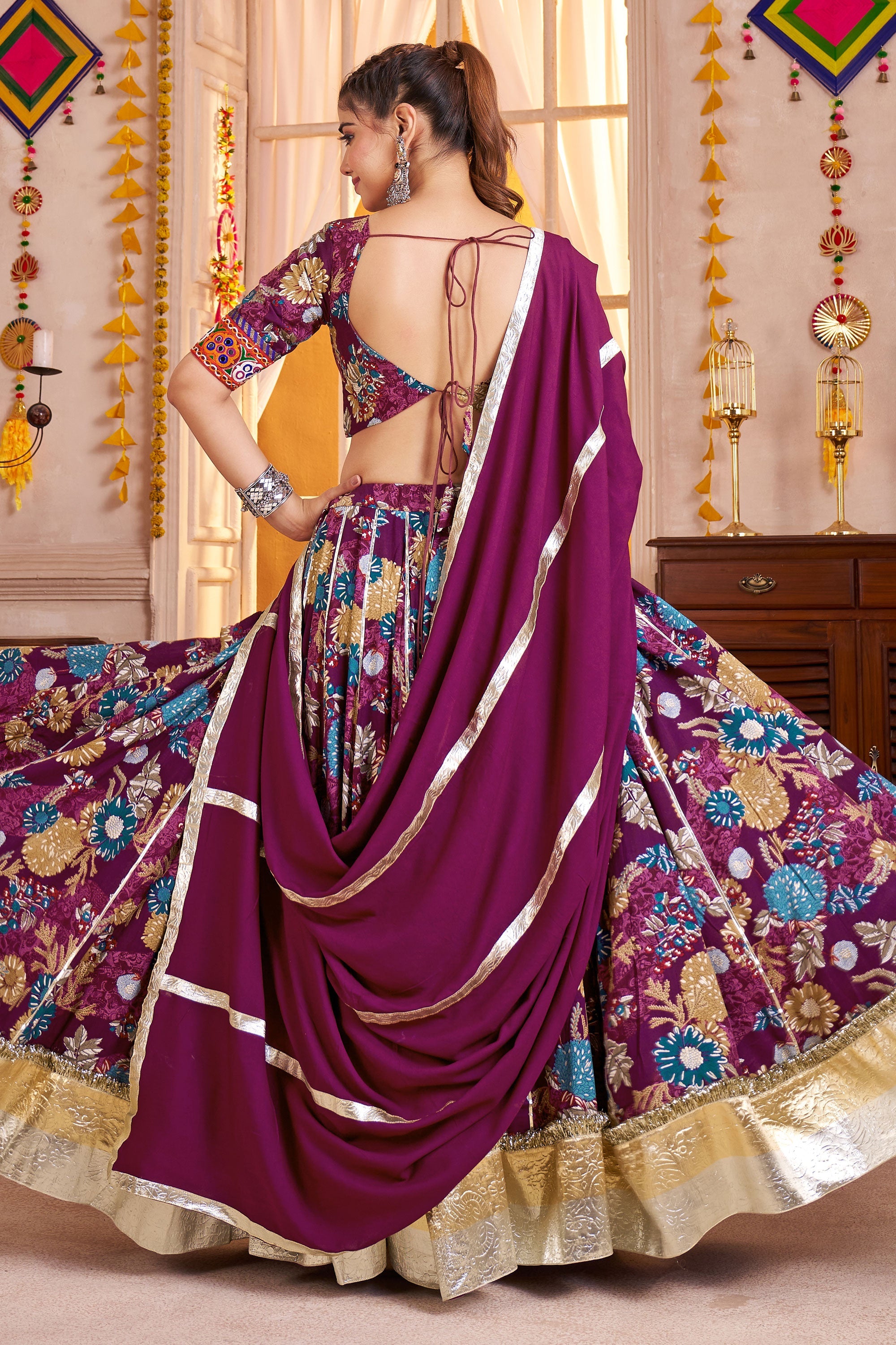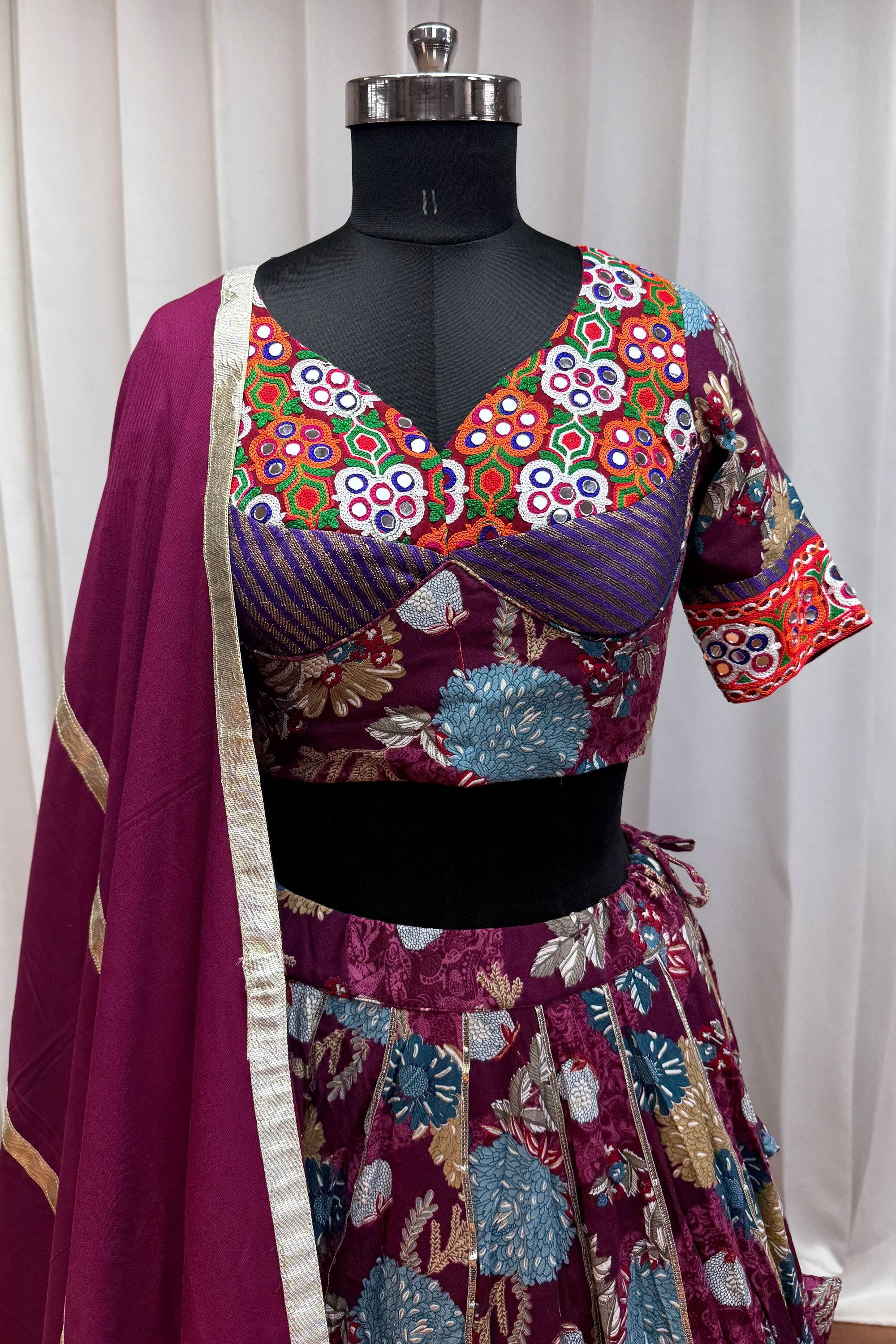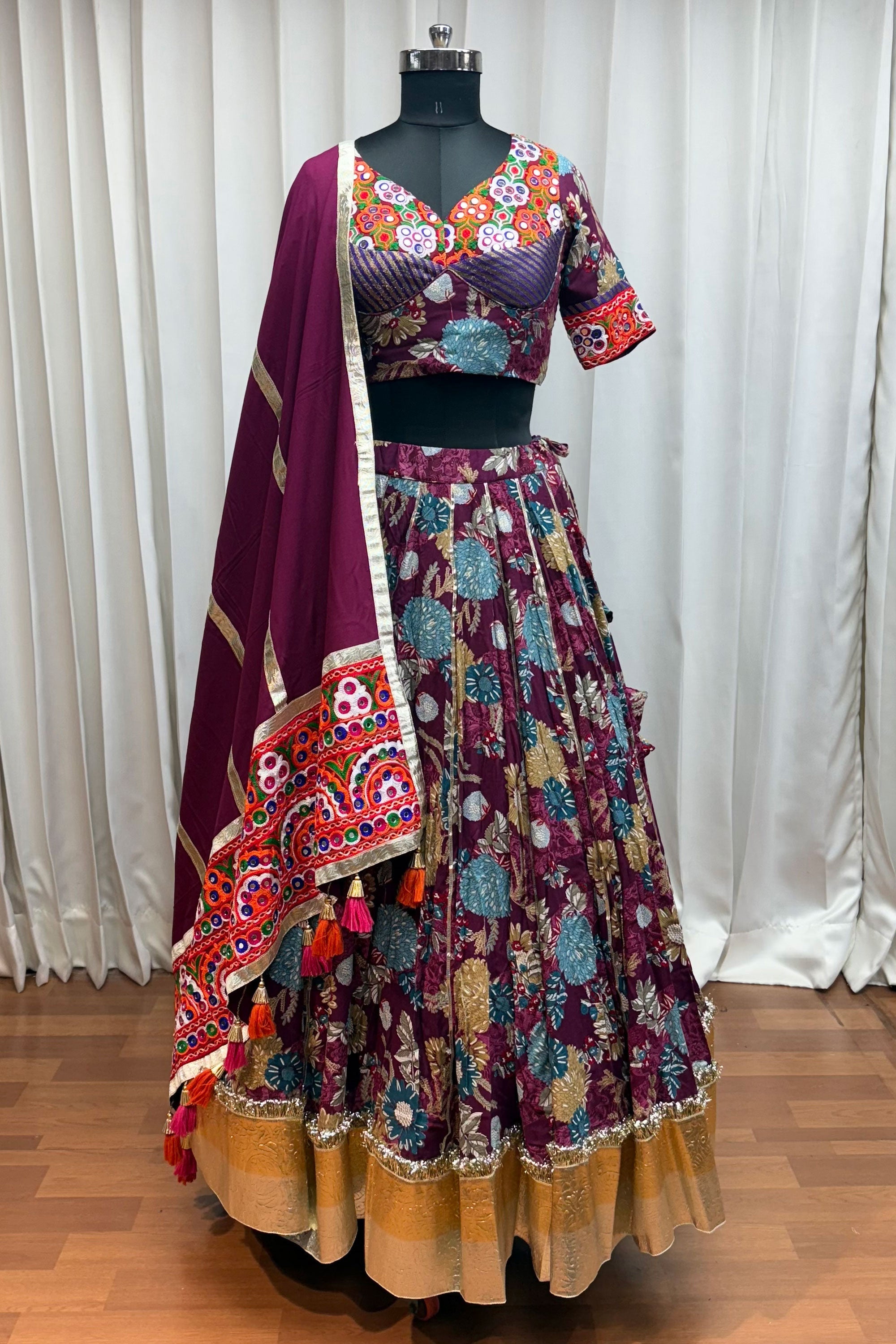 Add elegance and tradition to your wardrobe with this Viscose Cotton Lehenga featuring intricate embroidered mirror work, perfect for Navratri celebrations. Designed with comfort and style in mind, this lightweight yet luxurious outfit combines soft viscose cotton fabric with detailed craftsmanship to bring out your festive spirit. The flowing design enhances movement, allowing you to twirl effortlessly during Garba nights. This Lehenga showcases delicate mirror accents and vibrant embroidery that highlight cultural richness. Pair it with a matching blouse and dupatta to create an ensemble ideal for gatherings, temple visits, or family festivities. Make a memorable impression this season!