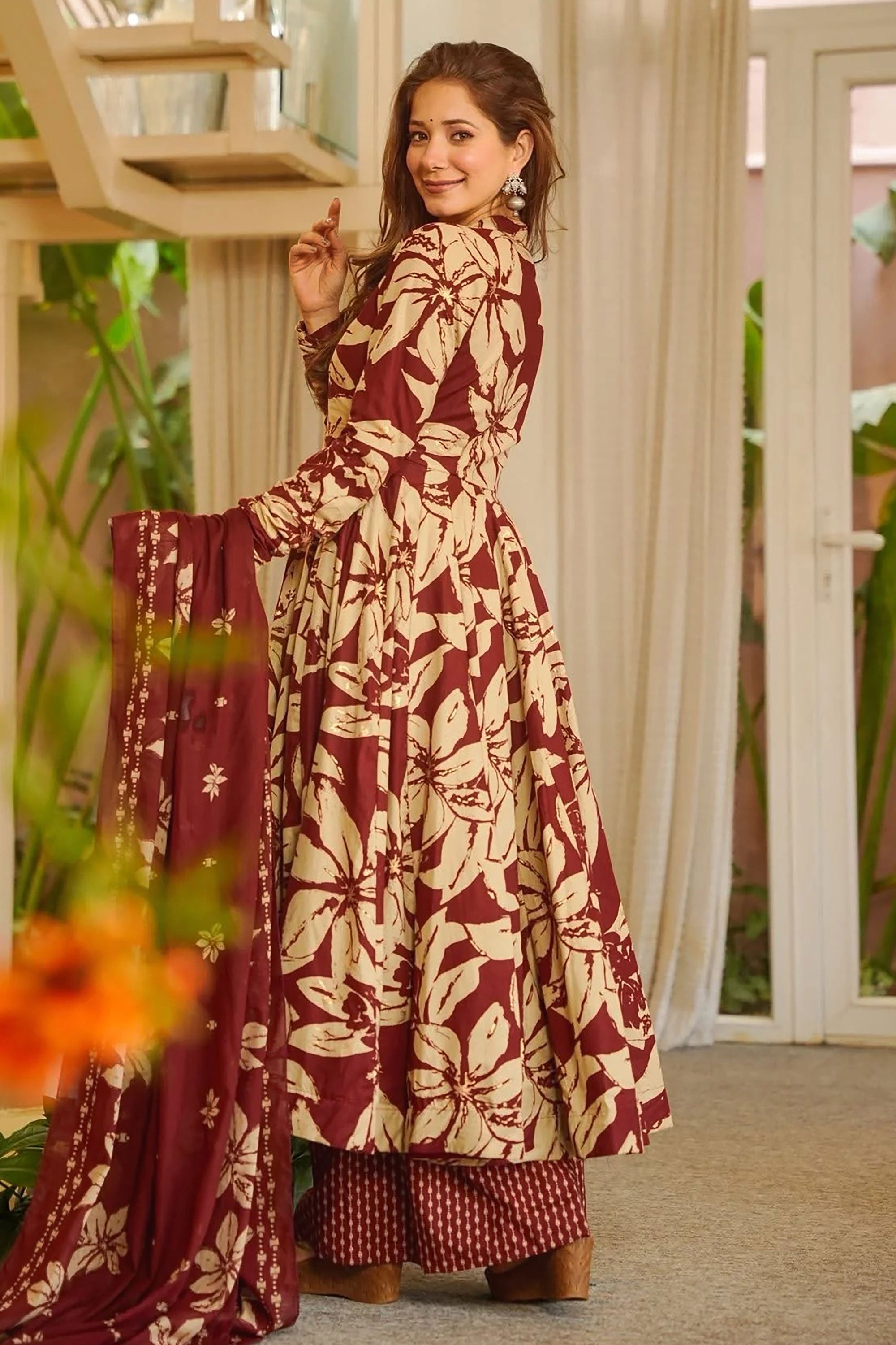 Attractive Maroon Muslin Printed Readymade Anarkali Style Suit