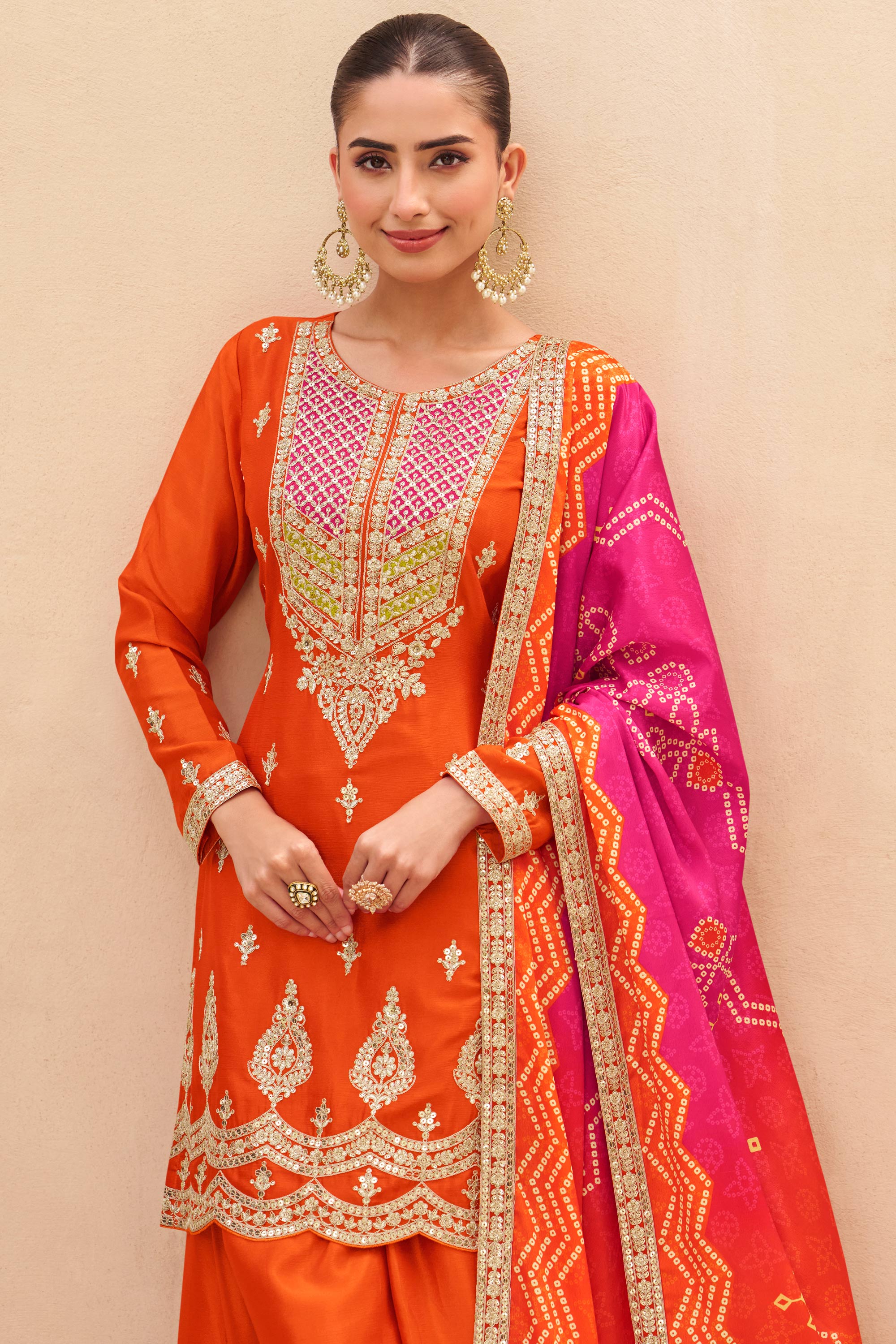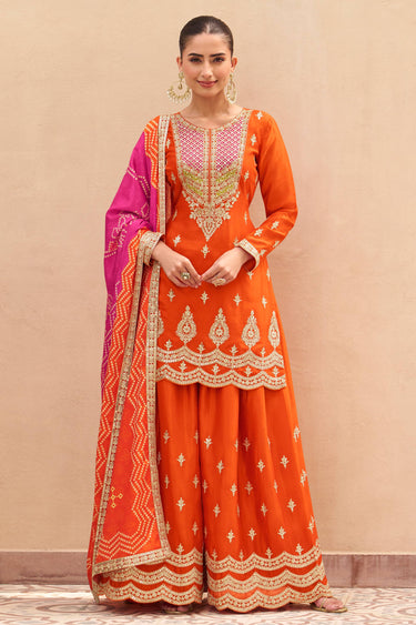 Chinon Silk Orange Readymade Palazzo Set With Neck Dupatta