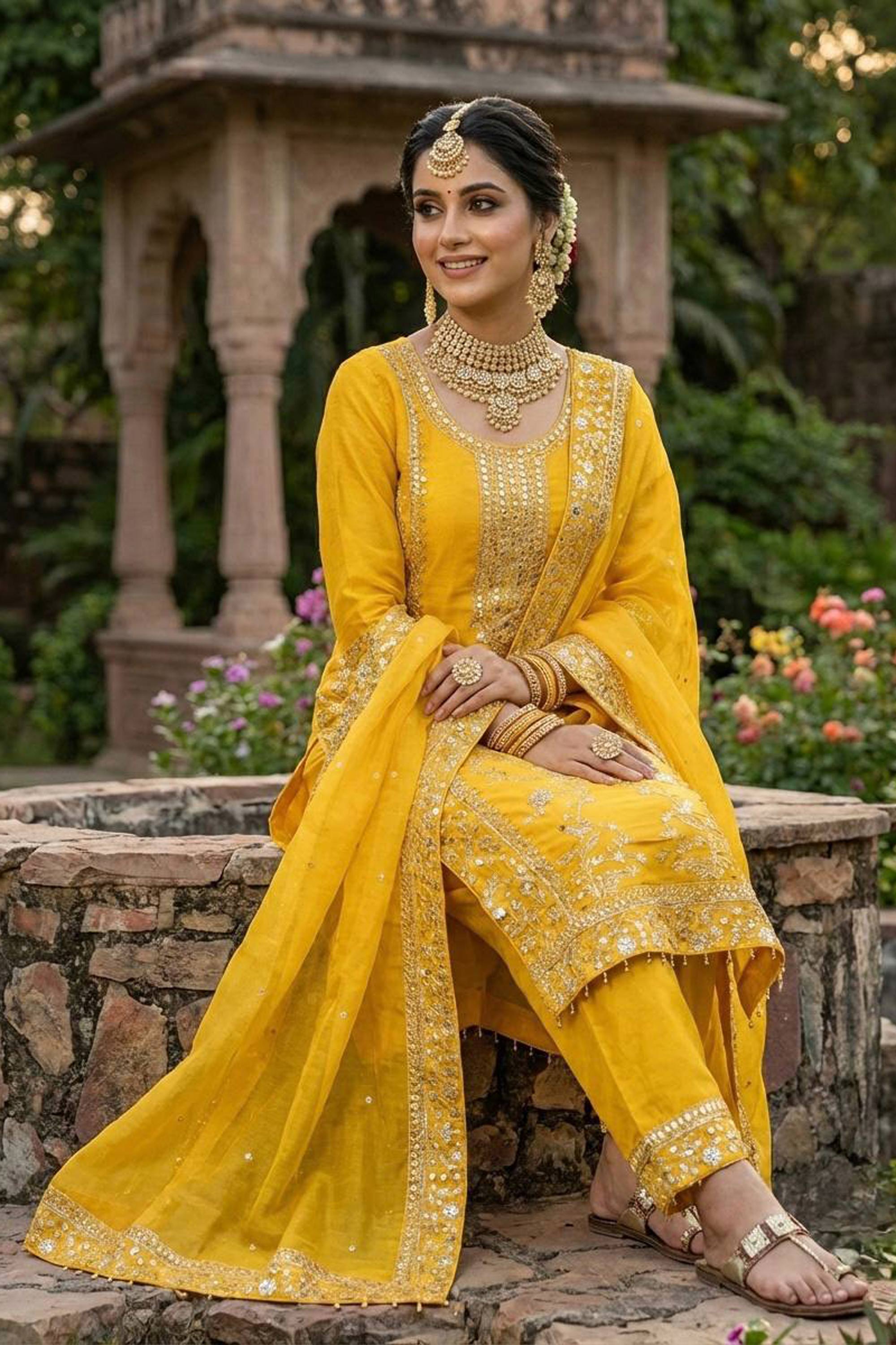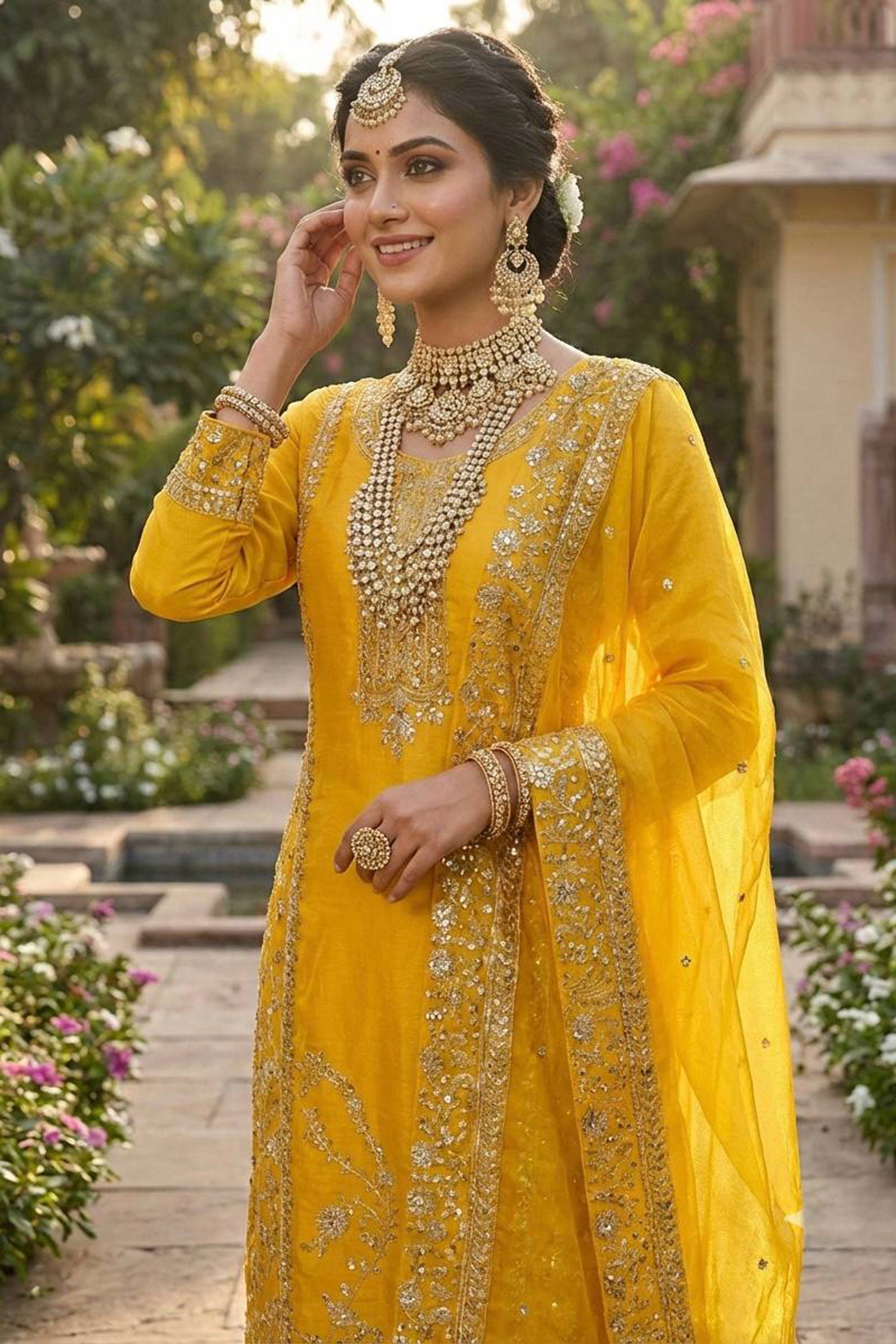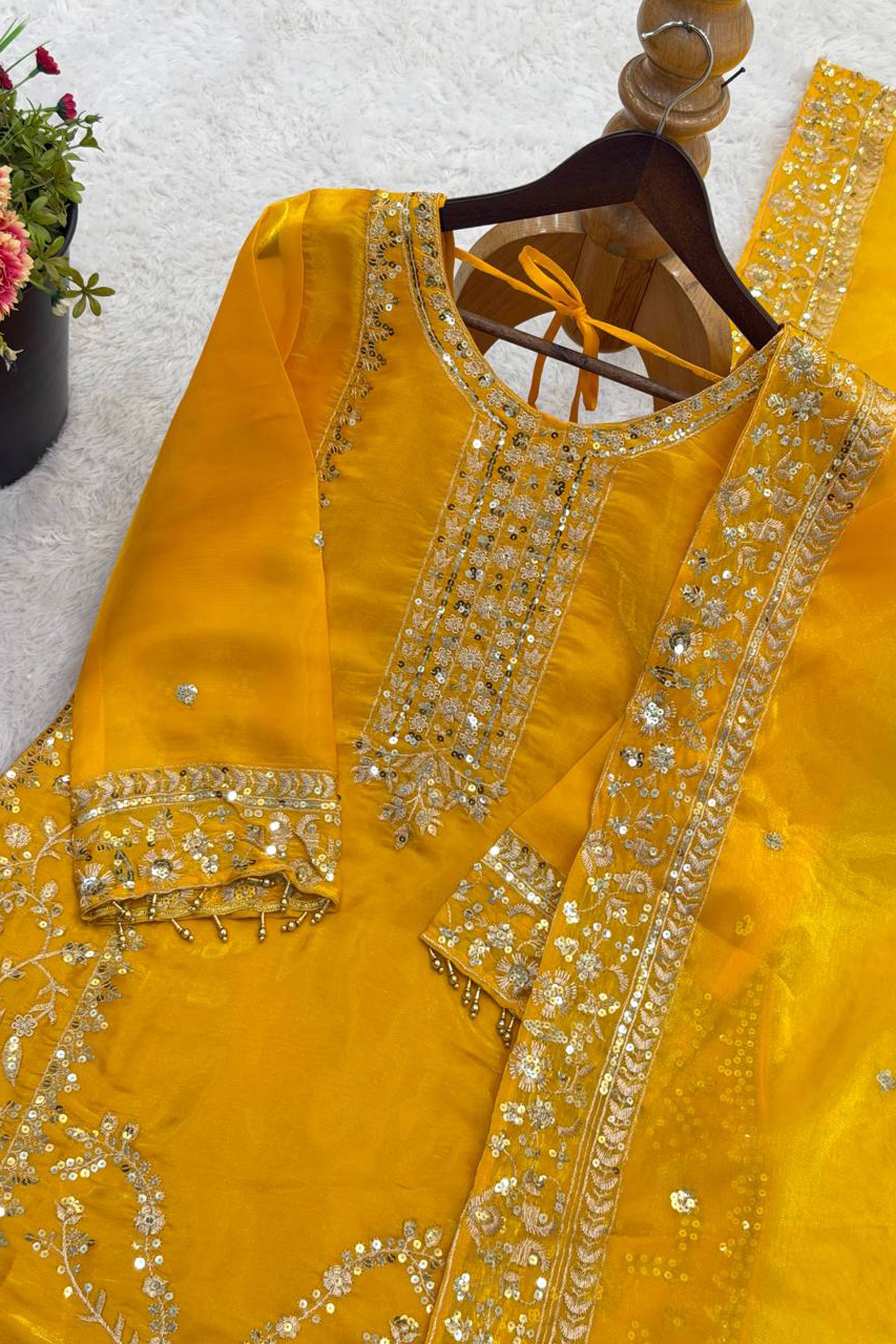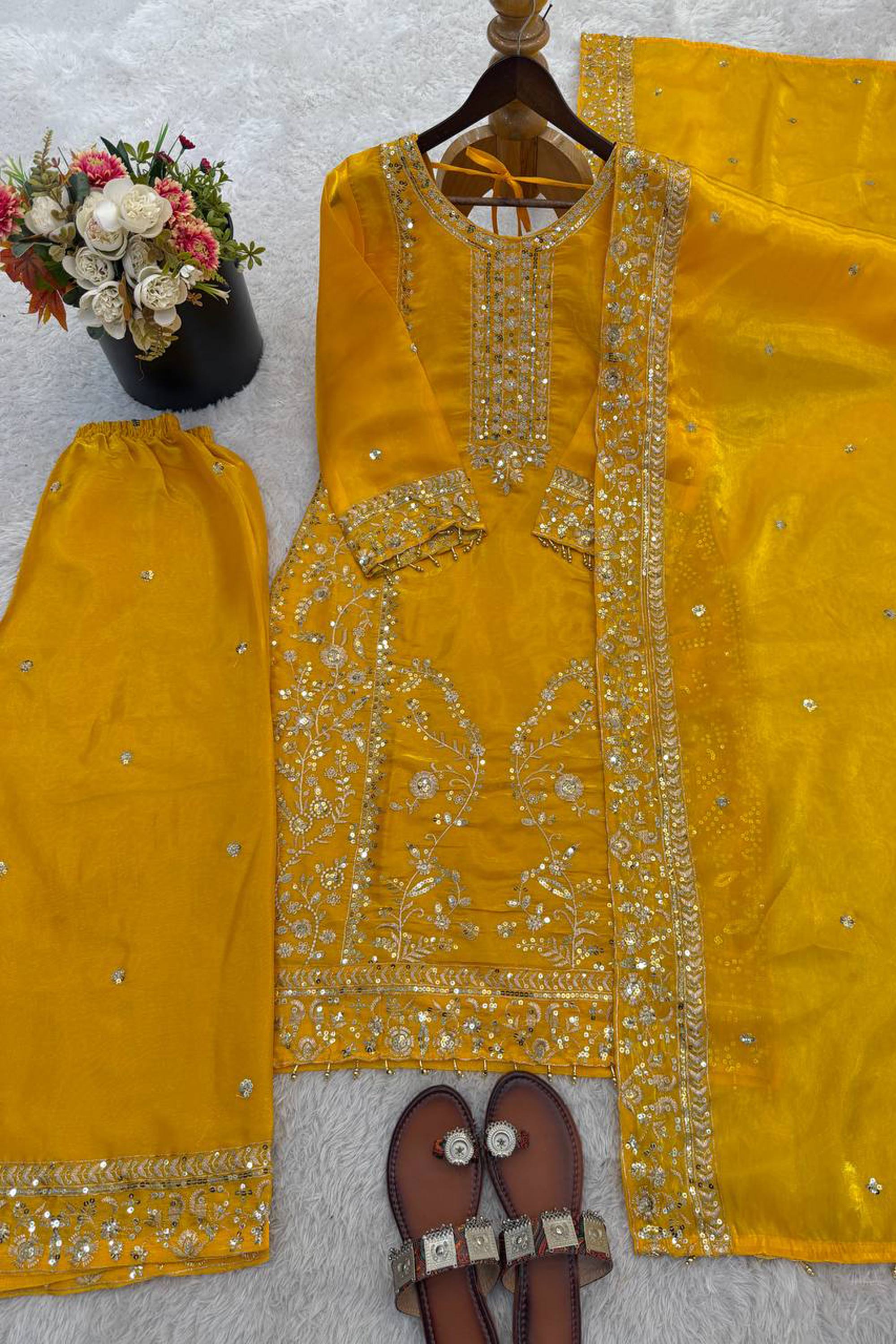 Embroidered Art Silk Yellow Festive Wear Readymade Palazzo Suit