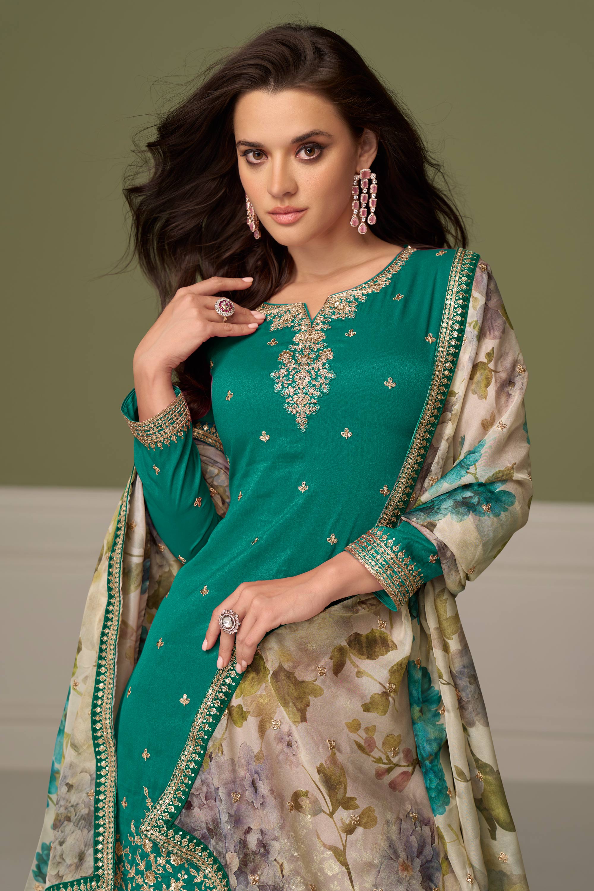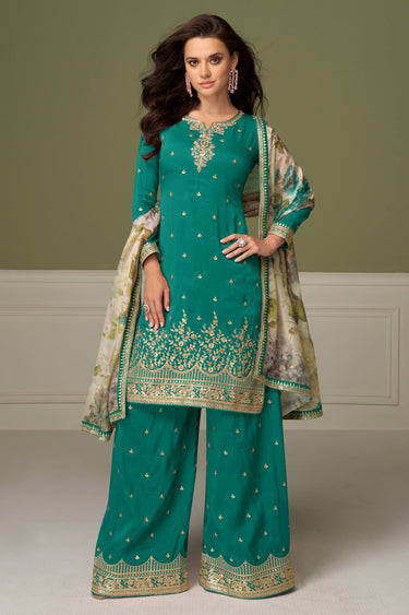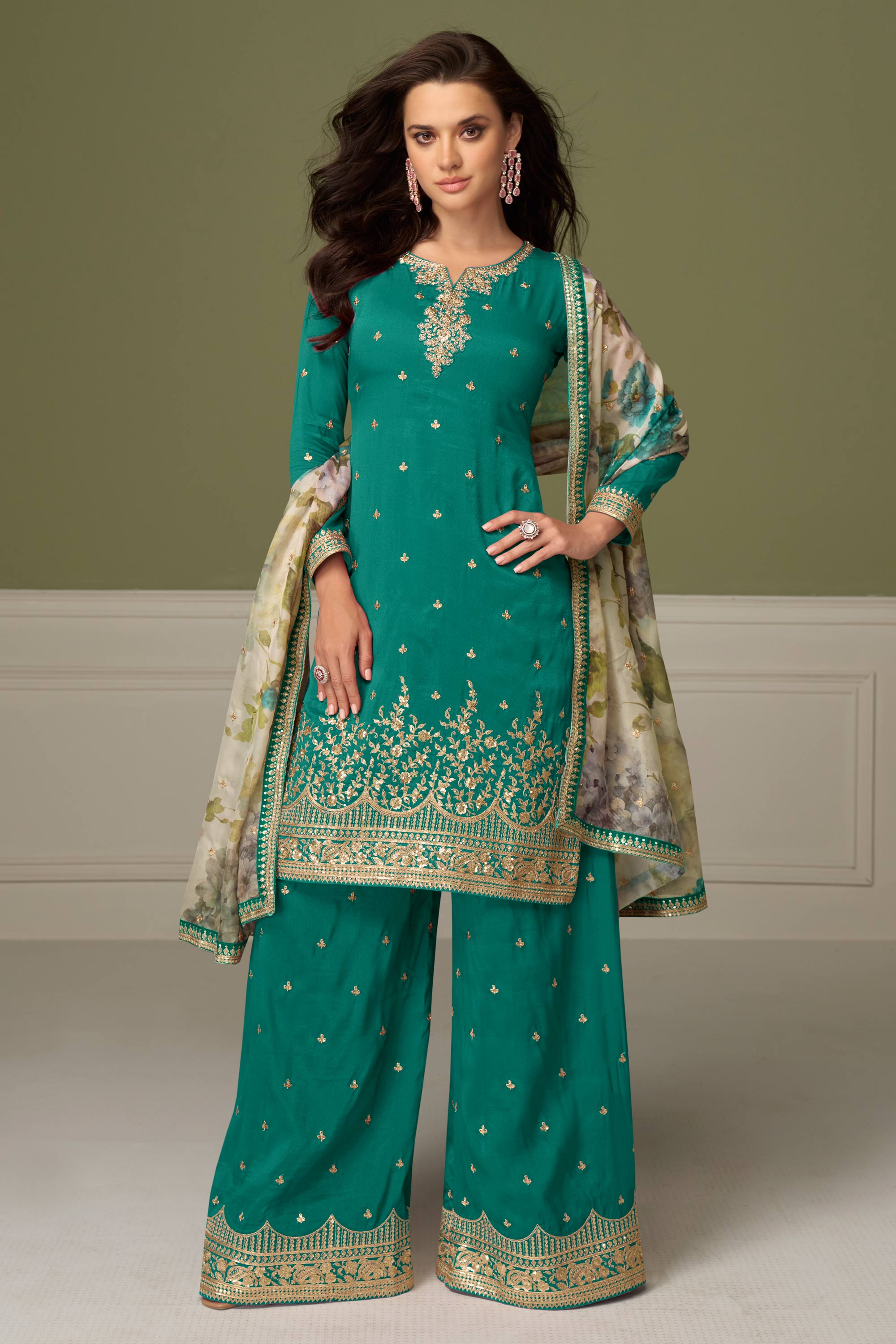 Art Silk Teal Embroidered Readymade Palazzo Salwar Suit