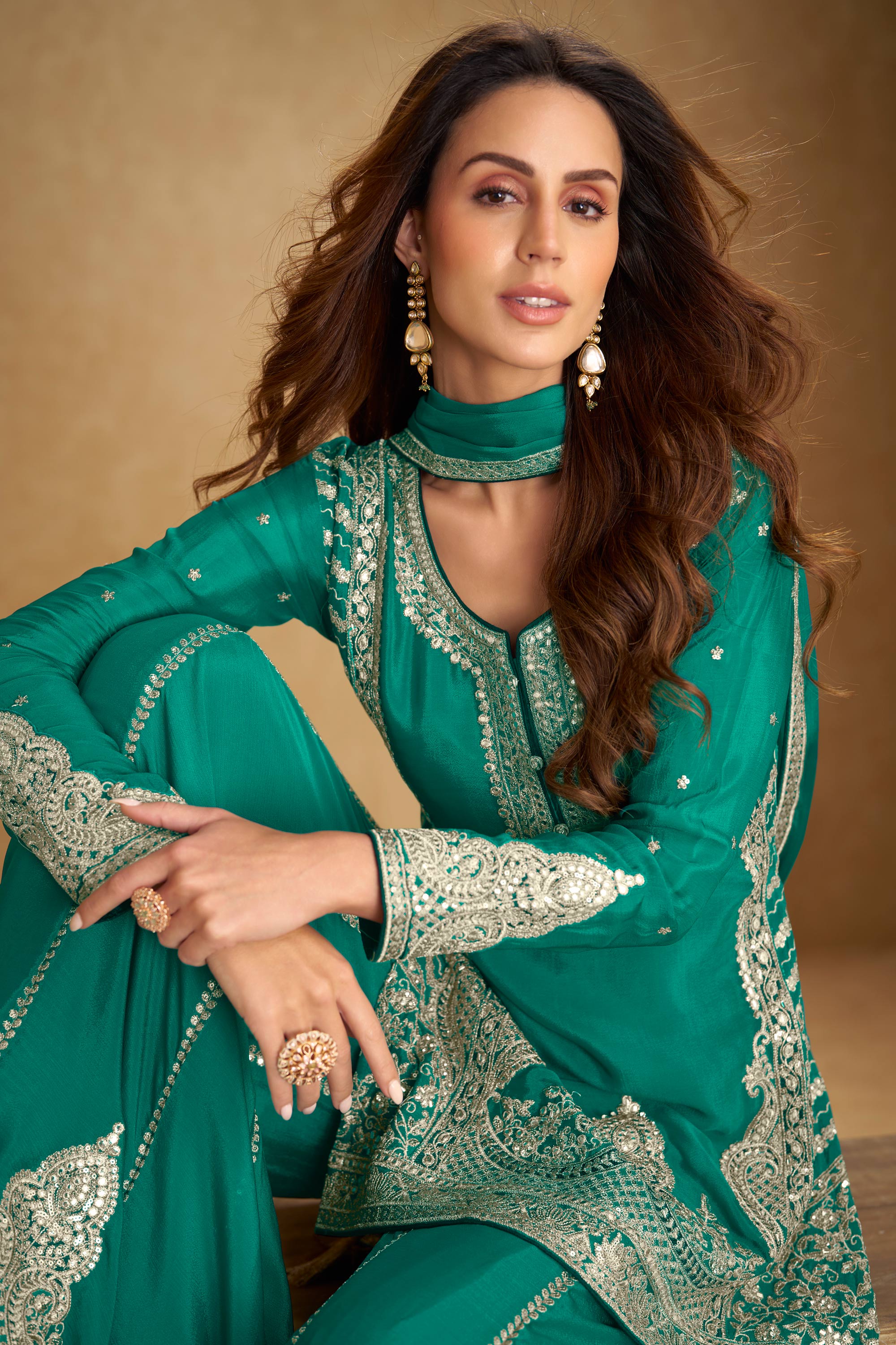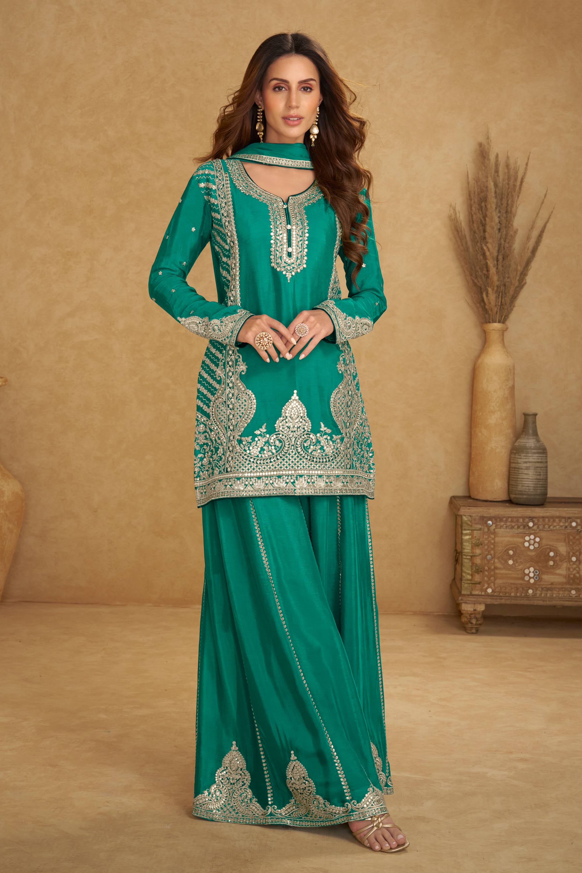 Chinon Embroidered Teal Sangeet Wear Readymade Palazzo Suit
