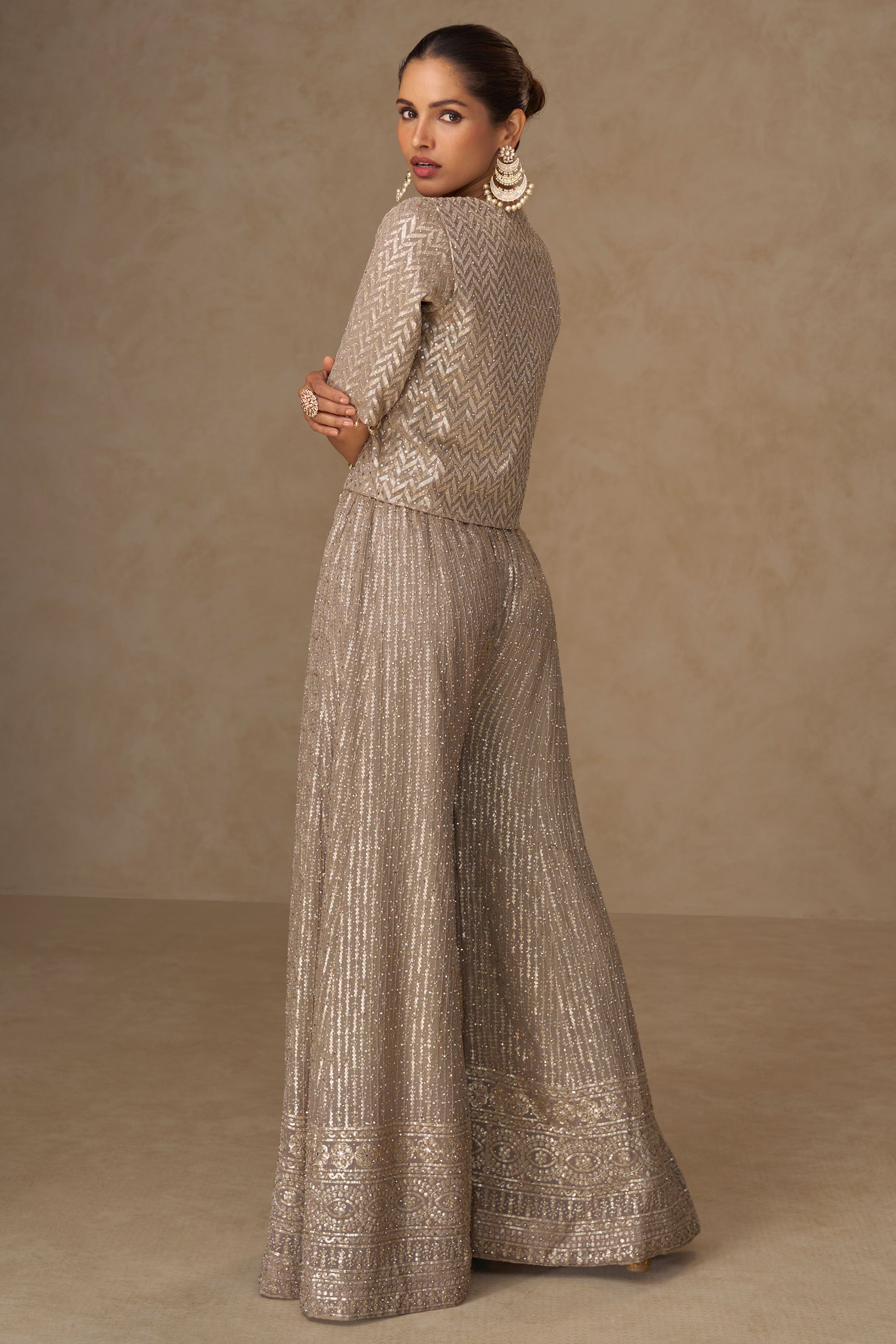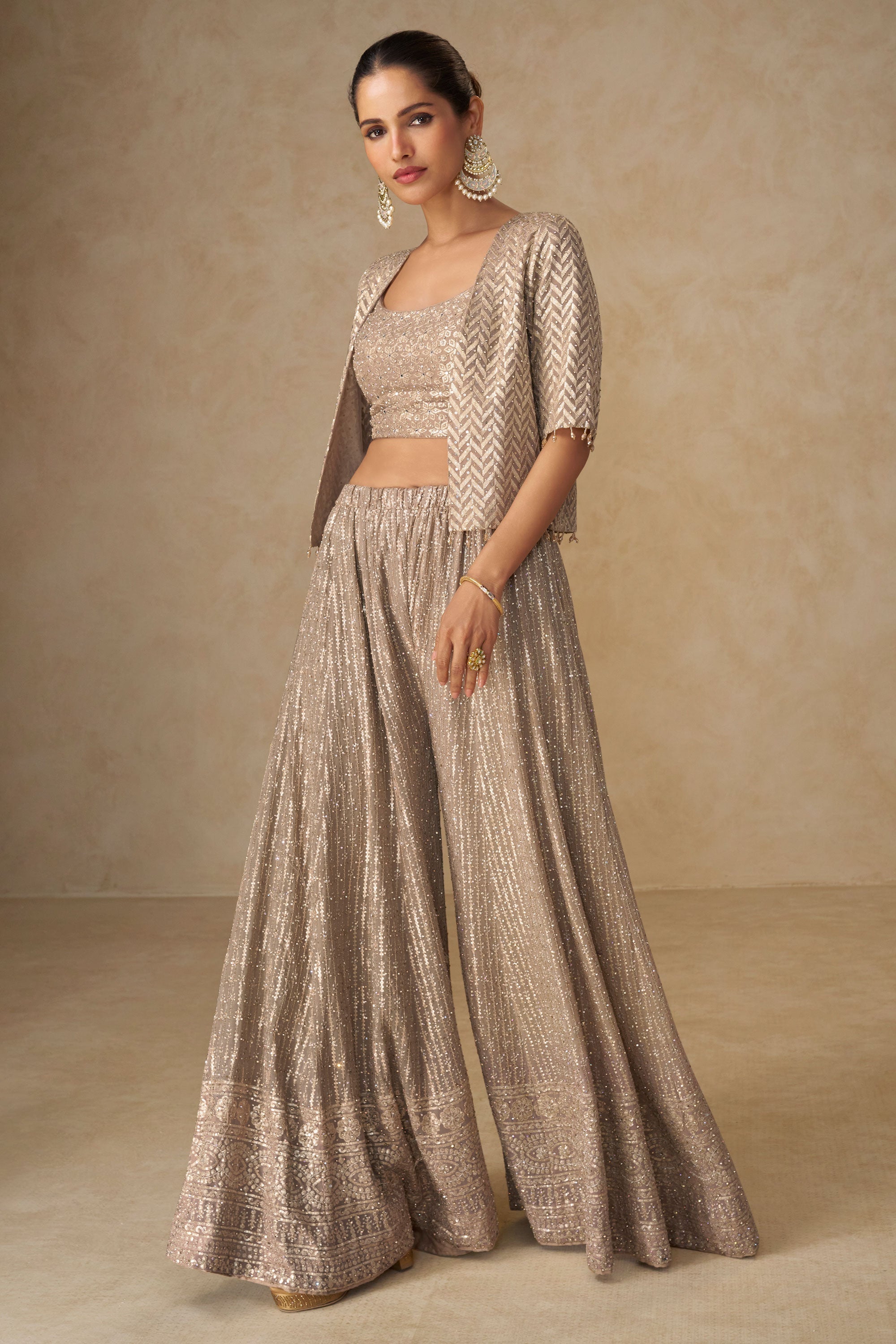 Cream Georgette Designer Readymade Palazzo With Designer Blouse And Jacket