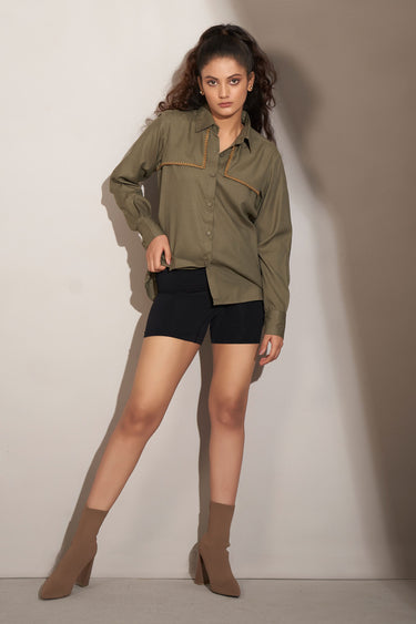 Exclusive Green Linen Fornt Panel Shirt With Thread Work Embroidery