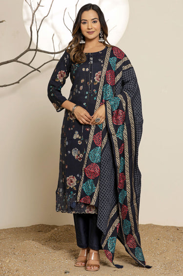 Exclusive Navy Blue Floral Printed Muslin Ethnic Set With Dupatta