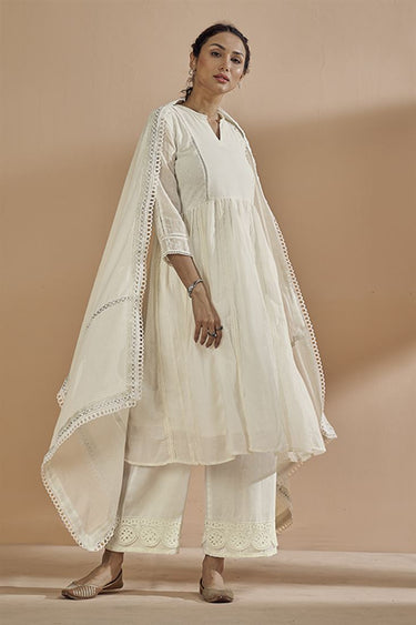 Exclusive White Cotton And Georgette Fabric Festive Wear Stylish Readymade Flared kurta Set With Bottom