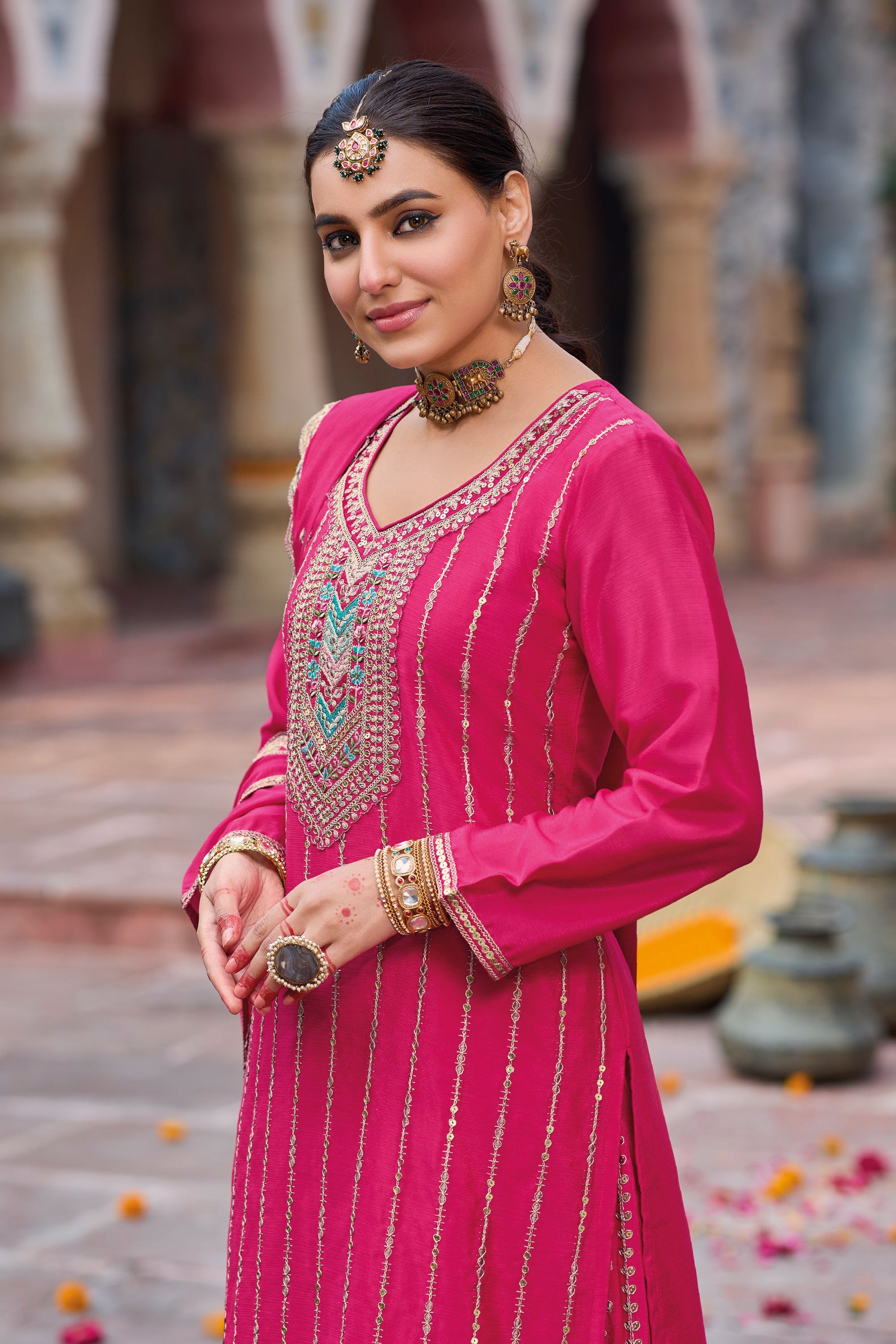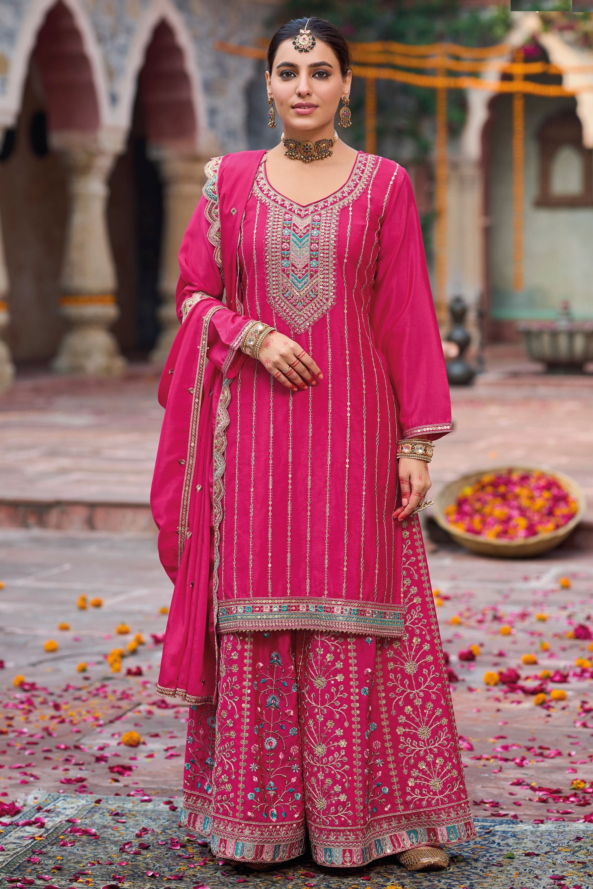 Add elegance to your wardrobe with this Chinon Embroidered Rich Color Designer Punjabi Style Palazzo Salwar Kameez. Crafted with beautiful embroidery, the vibrant hues and classic design are perfect for any special occasion. Ideal for functions, festivals, sangeet ceremonies, and weddings, this outfit exudes timeless tradition. Made from premium fabric, it offers unmatched comfort and grace. Pair it with your favorite accessories to complete your stunning ethnic look. Dry clean only to maintain its richness. Please note, slight color variation may occur.