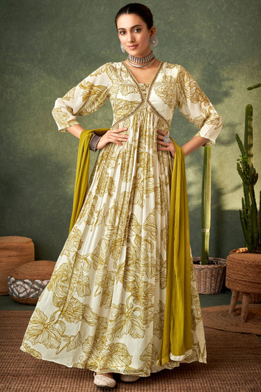 White Printed Readymade Gown In Chinon Fabric