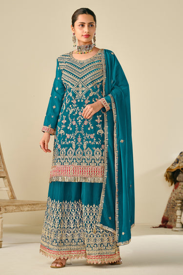 Attractive Teal Chinon Embroidered Readymade Palazzo Suit