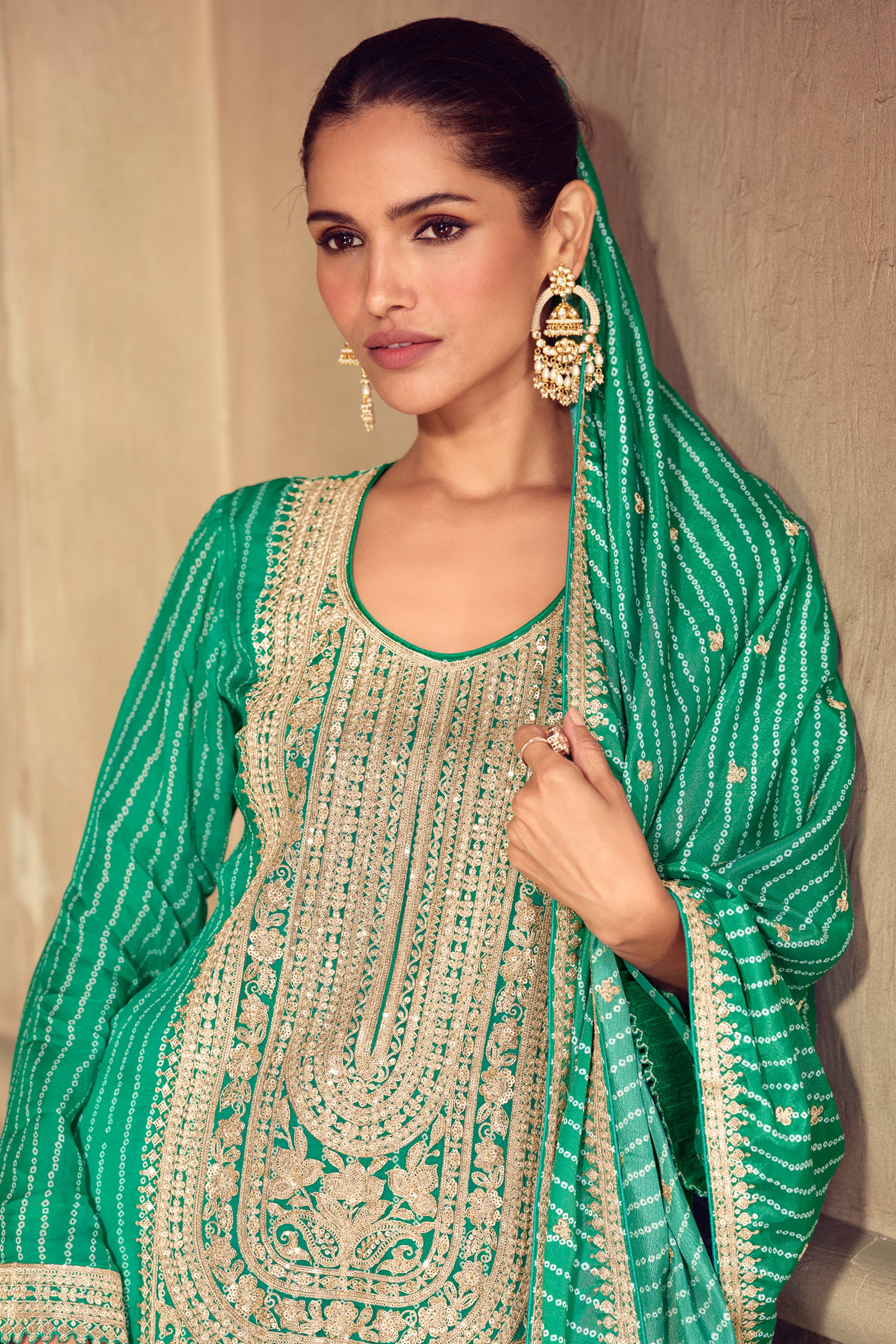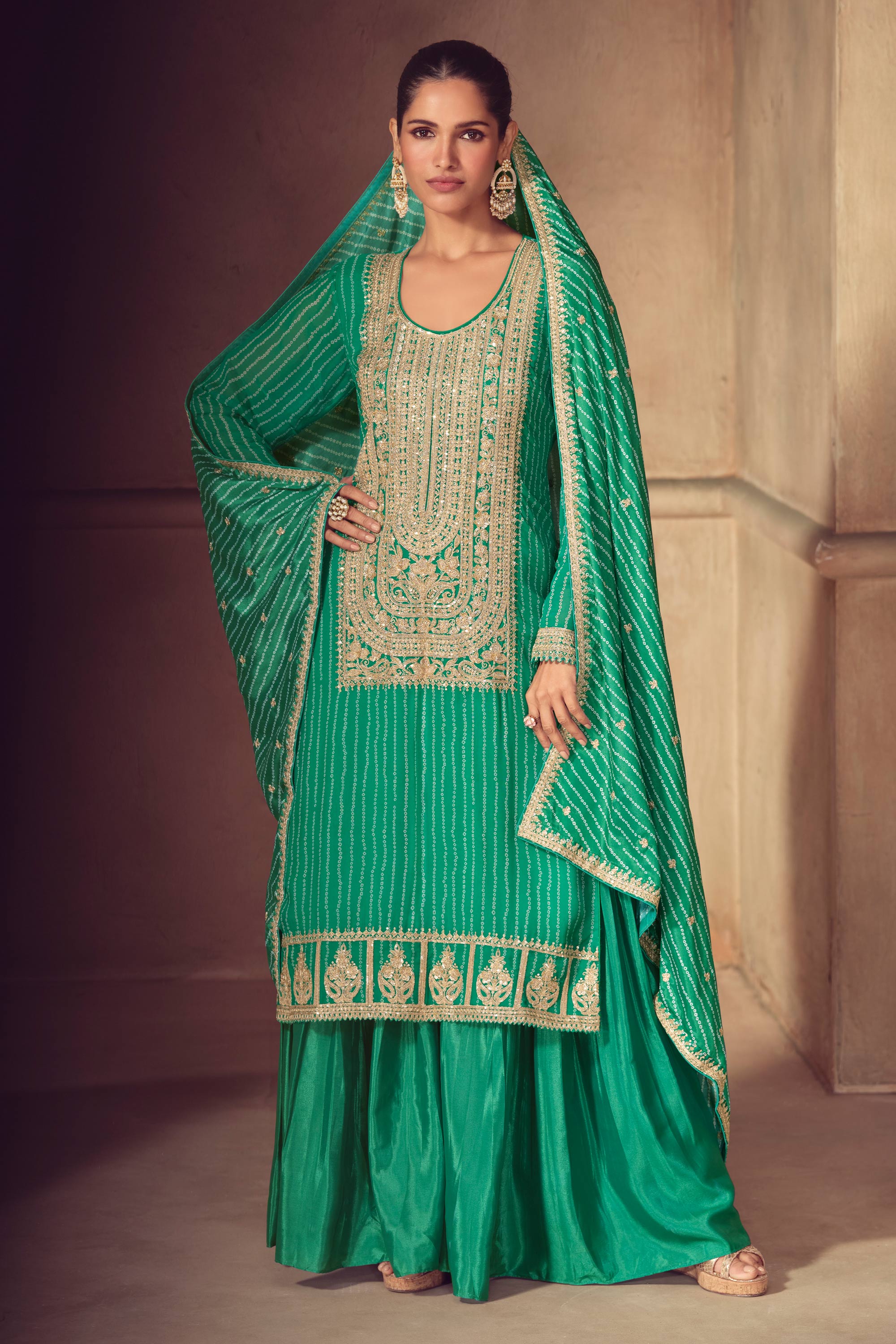 Green Chinon Embroidered Readymade Sharara Salwar Kameez