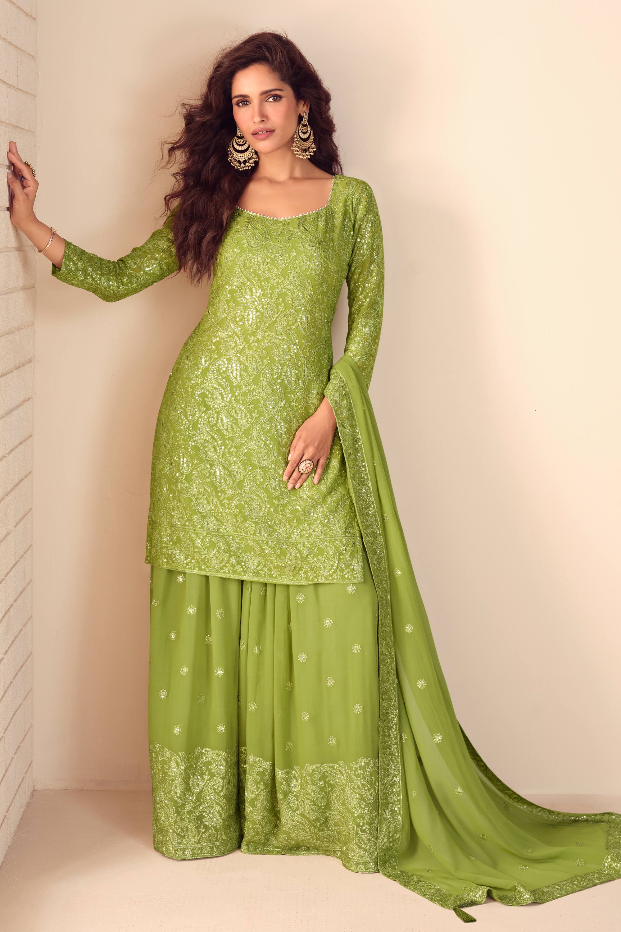 Green Georgette Embroidered Readymade Palazzo Dress