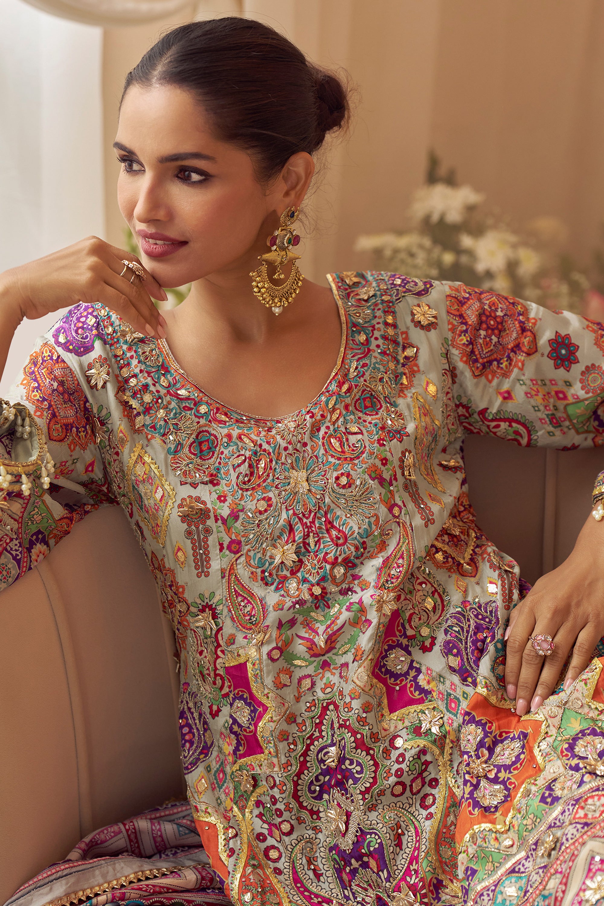 Enhance your ethnic wardrobe with this stunning Ethnic Women Wear Multi Color Crepe Silk Digital Print Readymade Sharara Set. The fine crepe silk fabric ensures a soft touch, while the intricate digital prints bring bold colors and intricate designs to life. This easy-to-wear sharara set combines traditional flair with modern convenience, making it an ideal choice for festive gatherings or wedding functions. With its thoughtful fit and unique design, this outfit stands out as a stylish and practical choice. Elevate your outfit by pairing it with your favorite ethnic footwear and jewelry.