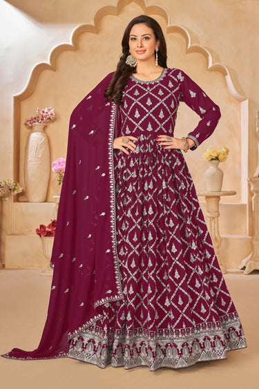 Wine Color Embroidered Long Anarkali Suit In Georgette Fabric