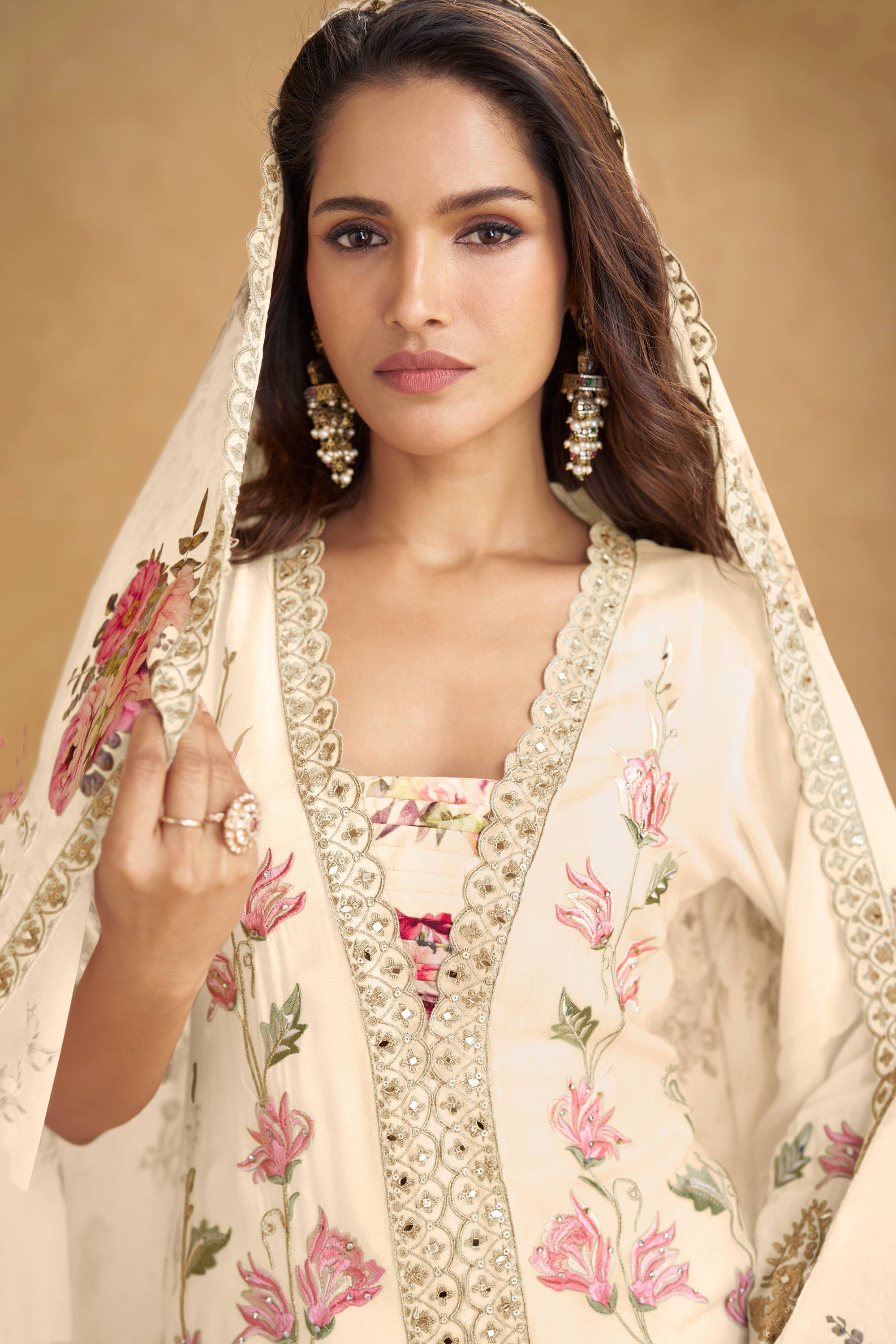 Beige Festive Wear Chinon Embroidered Readymade Palazzo Suit With Dupatta