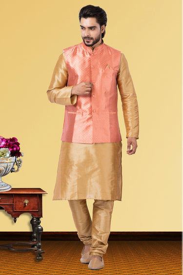 Elevate your traditional wear with the Reception Wear Readymade Reach Color Beautiful Kurta Pyjama For Men. This ensemble comes with a stylish 3 pcs jacket set, perfect for festive occasions or wedding receptions. Crafted from high-quality Dhupion Raw Silk, the kurta pyjama offers a comfortable and elegant fit, ensuring you look dapper. The vibrant Reach Color adds a touch of sophistication and grandeur to your wardrobe. Pair it with classic juttis for a complete ethnic look. Embrace tradition with a contemporary twist!