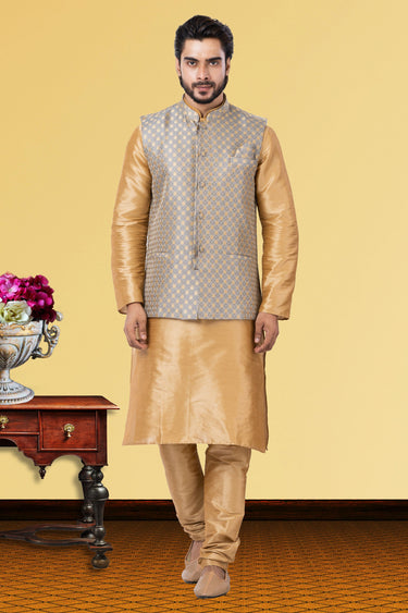 Cream Reception Wear Readymade Dhupion Raw Silk Fabric Kurta Pyjama For Men With Jacket