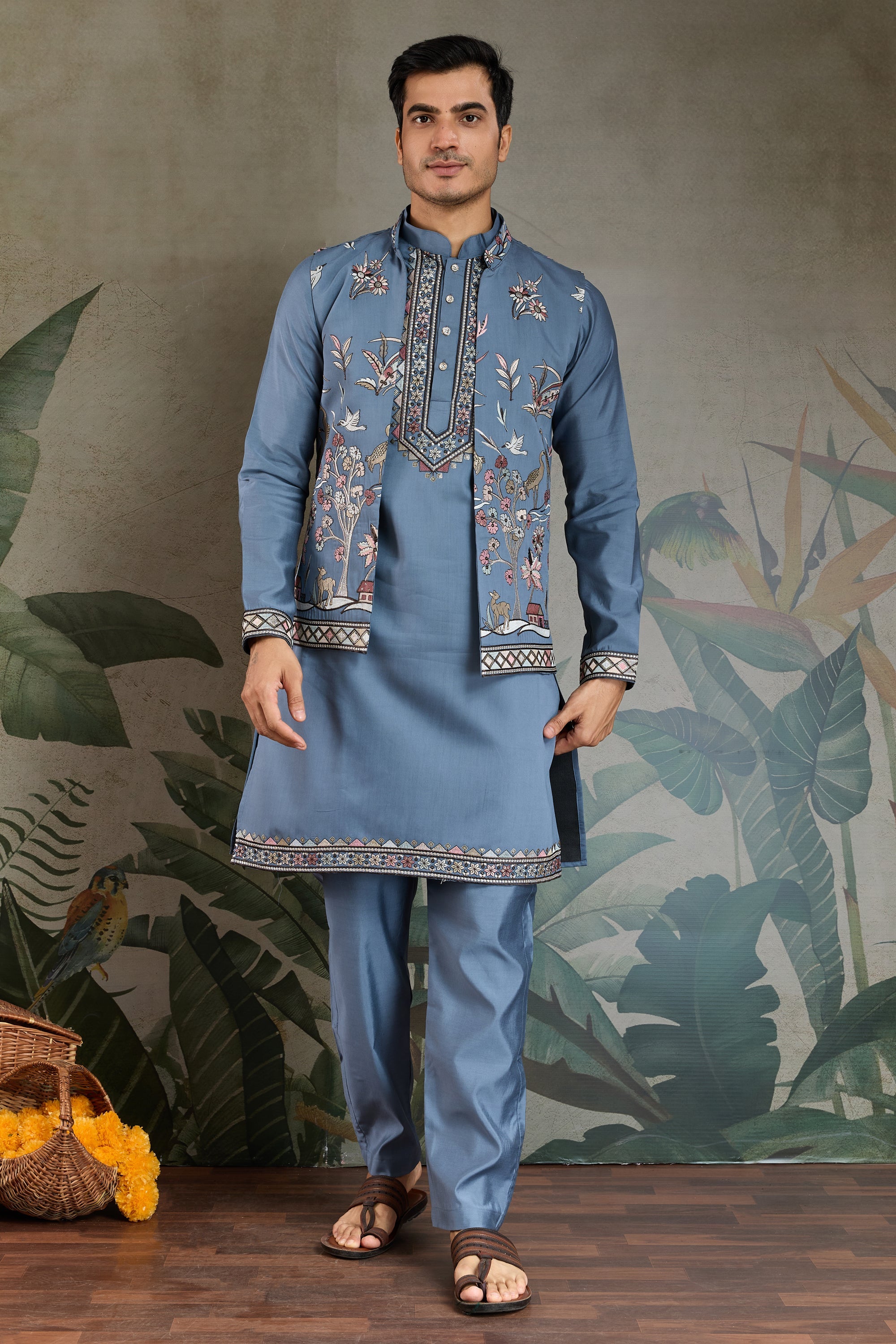 Fancy Blue Viscose Silk Sangeet Wear Readymade Kurta Pyjama For Men With Jacket Set