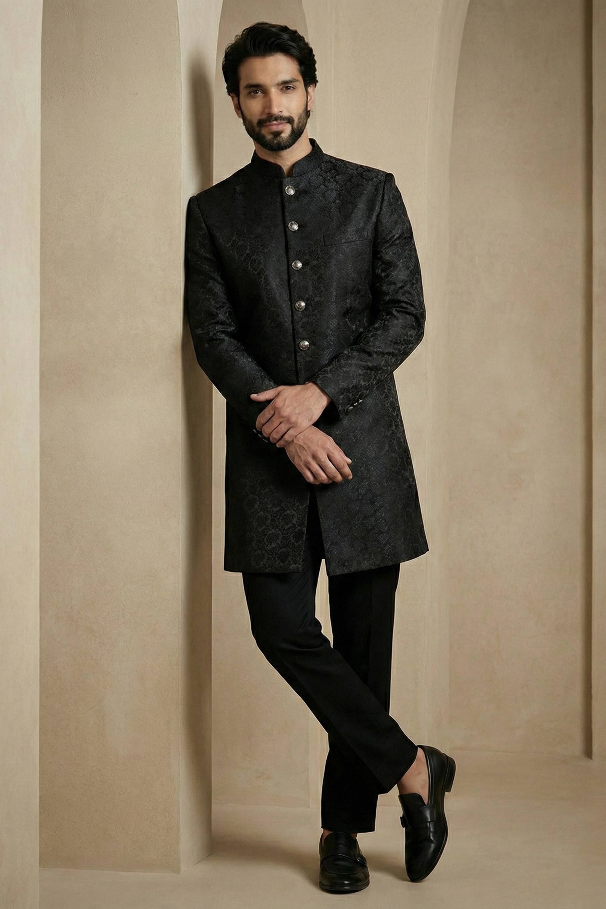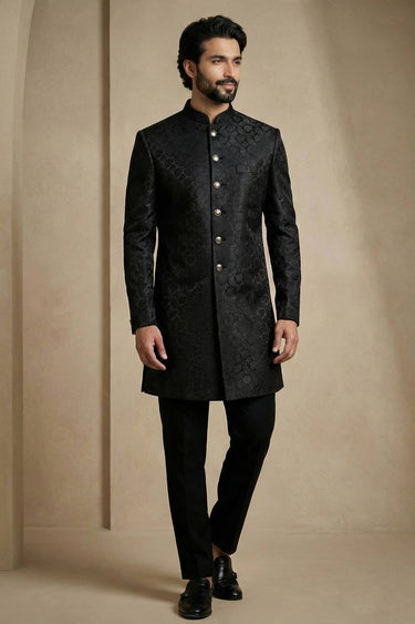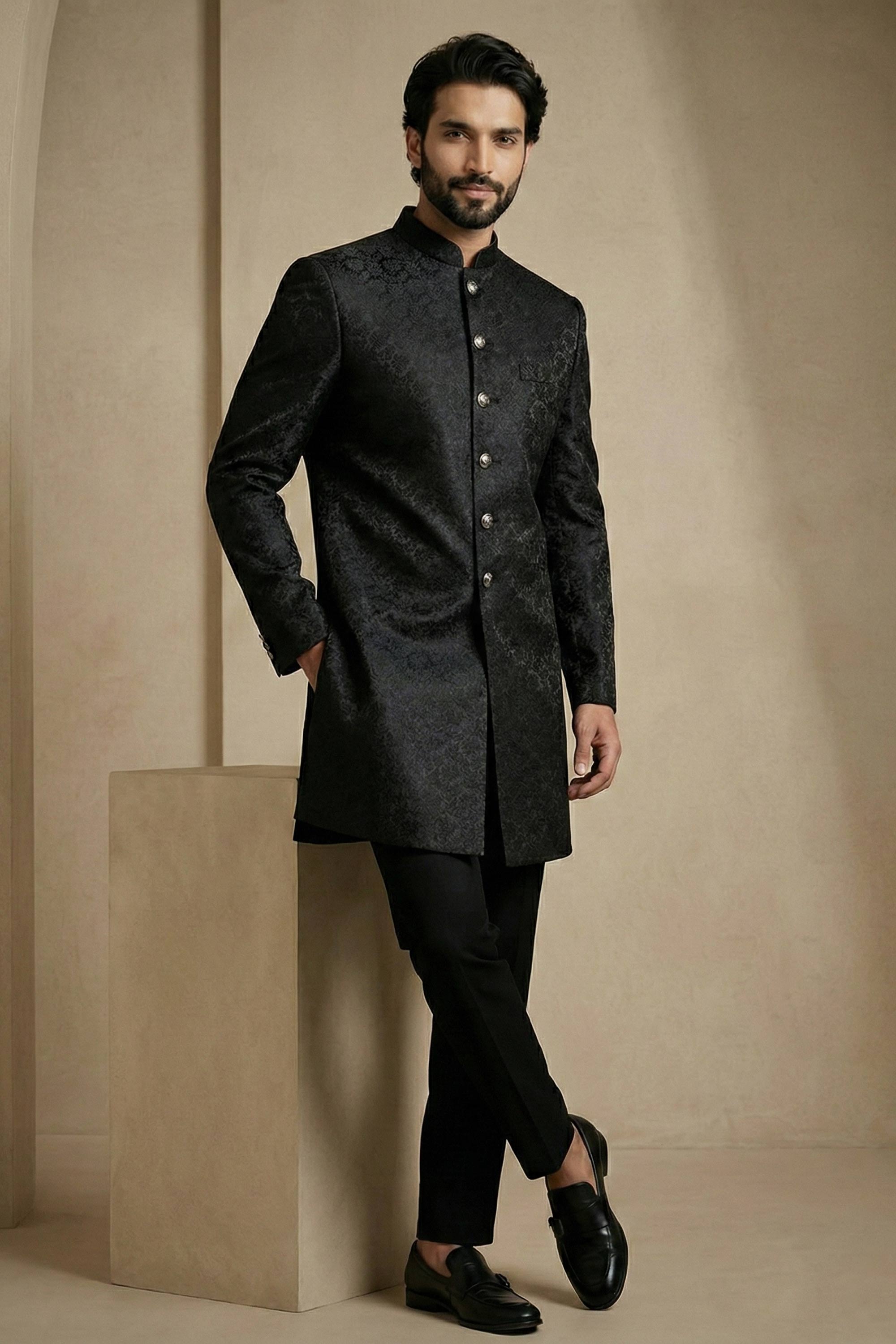 Jacquard Fabric Black Sangeet Wear Readymade Indo Western For Men