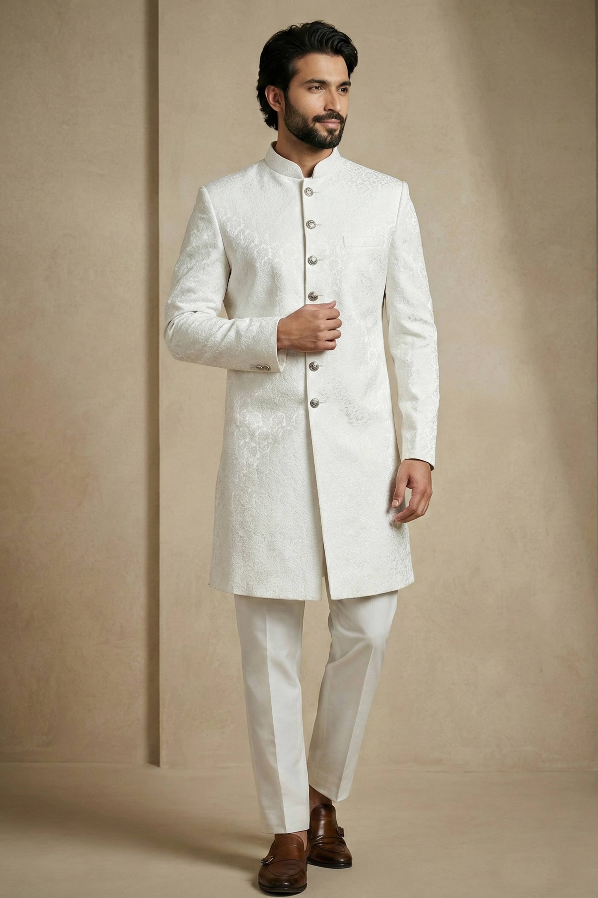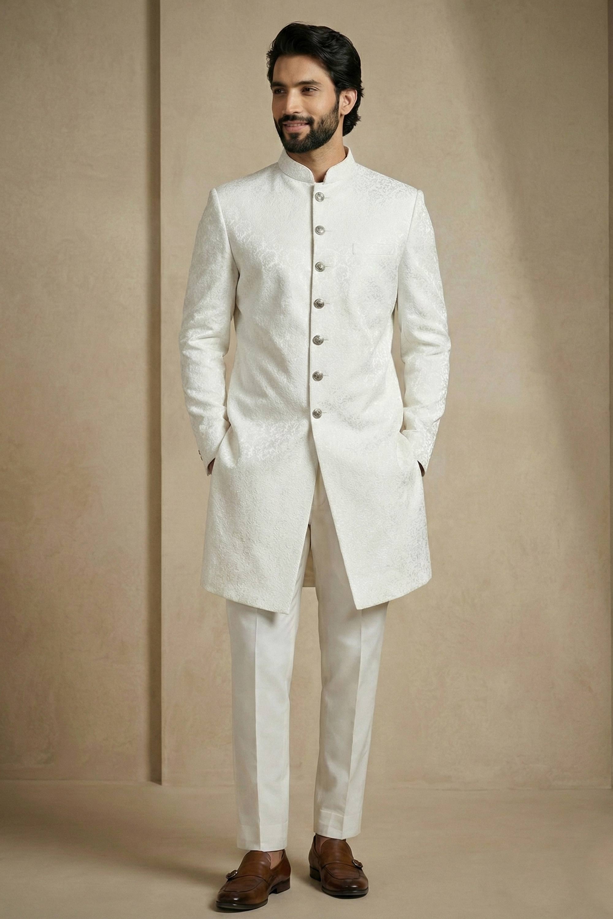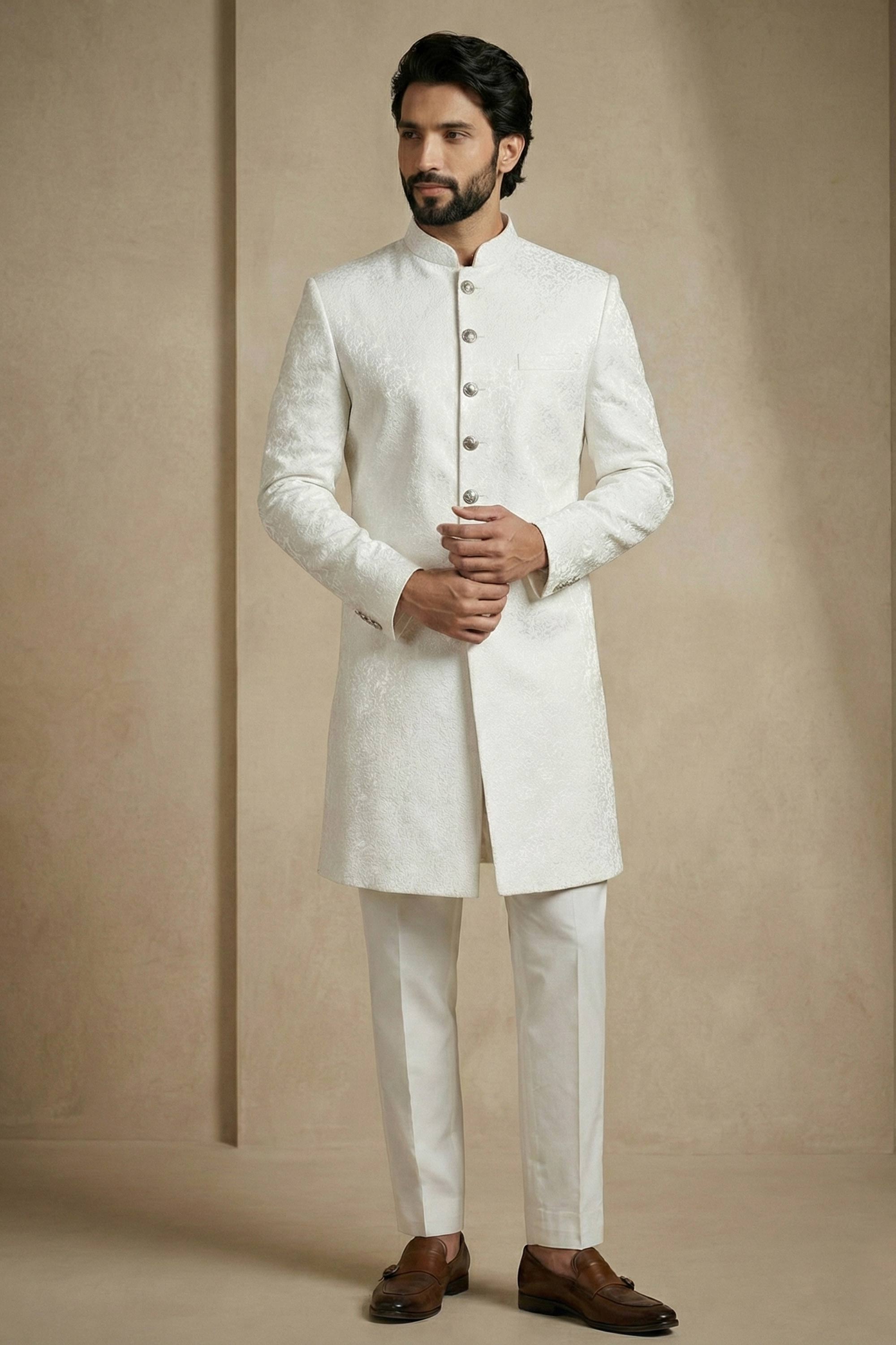 Jacquard Fabric White Sangeet Wear Readymade Indo Western For Men