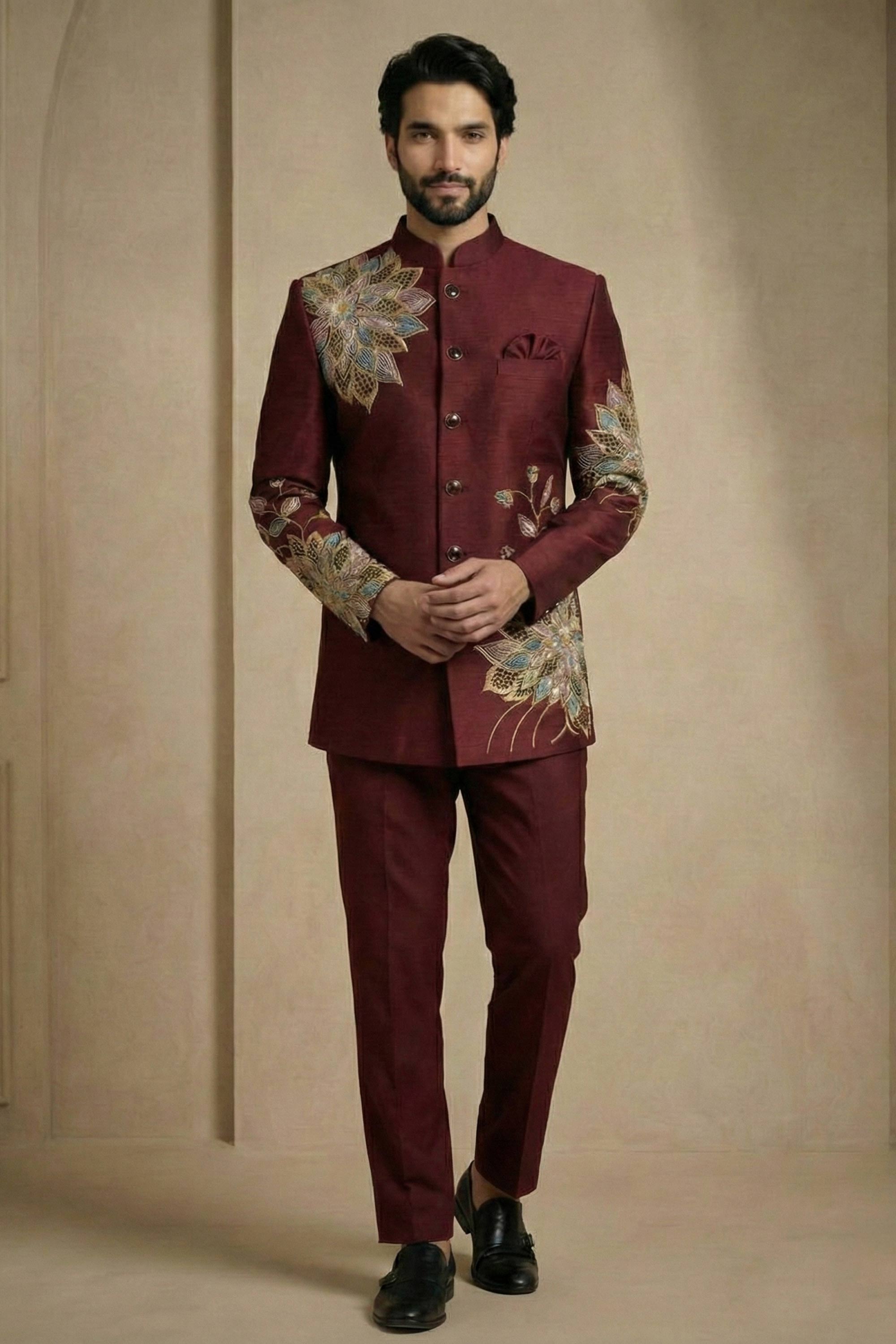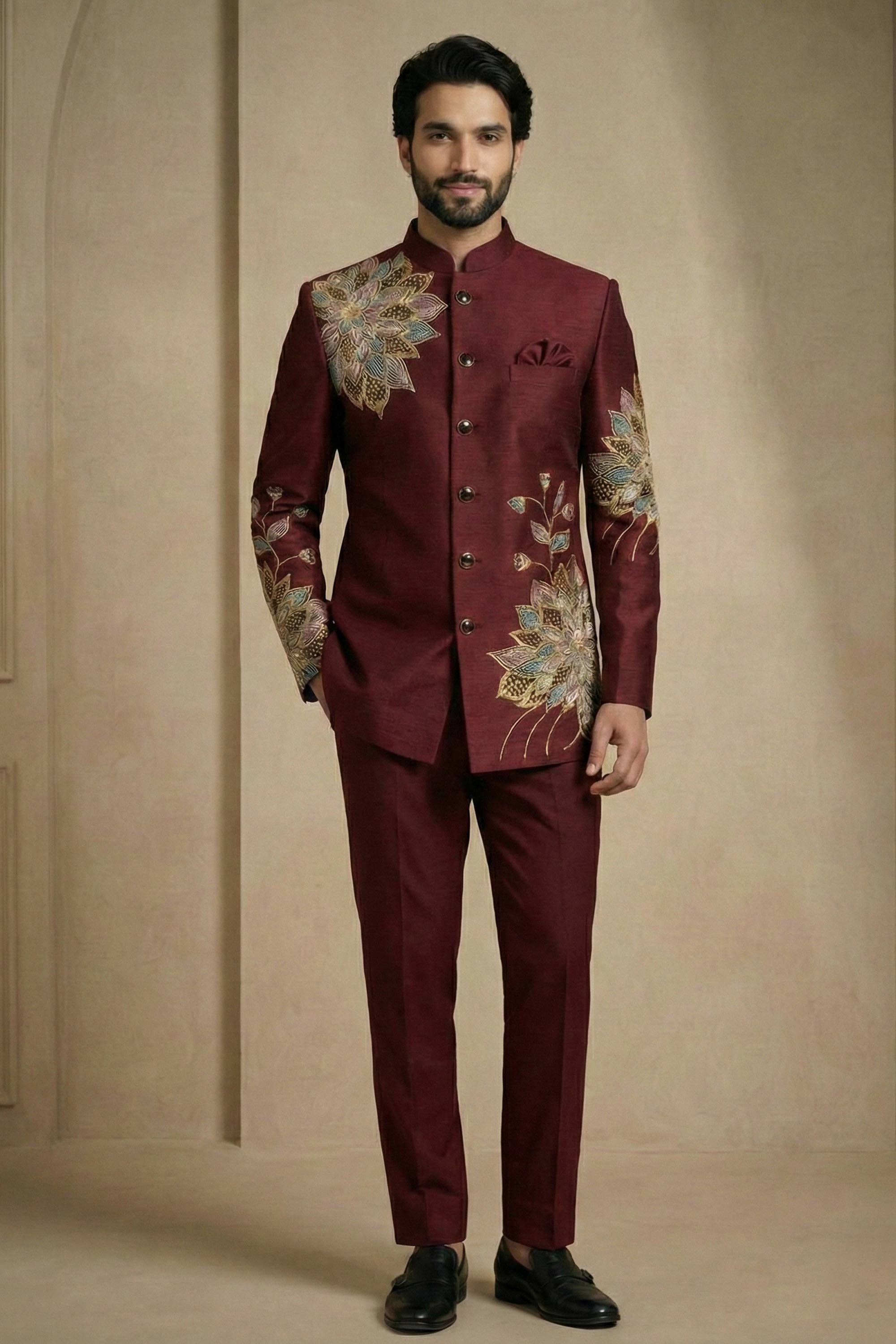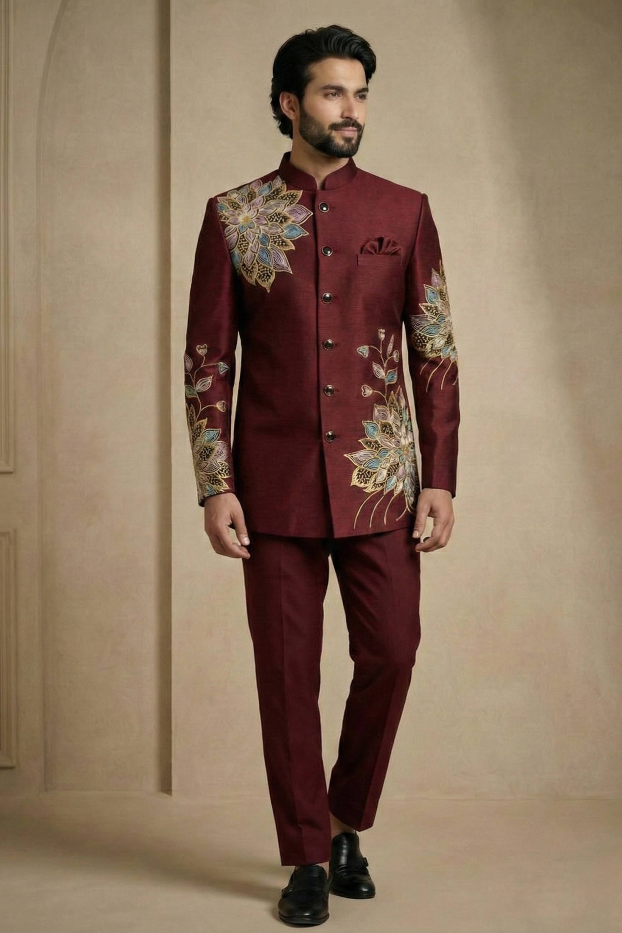Maroon Sangeet Wear Satin Silk Embroidered Readymade Jodhpuri Suit For Men