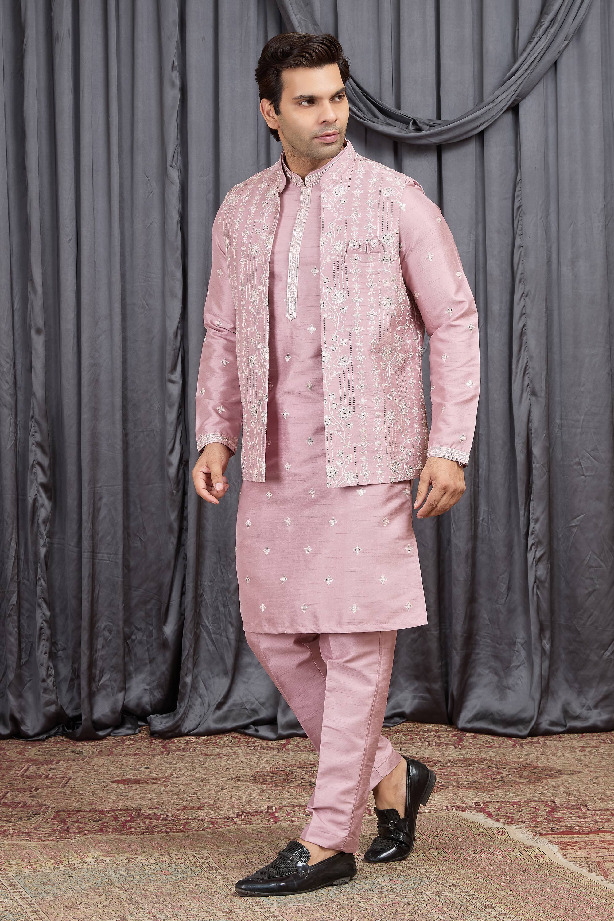 Pink Sangeet Wear Embroidered Readymade Kurta Pyjama With Jacket For Men