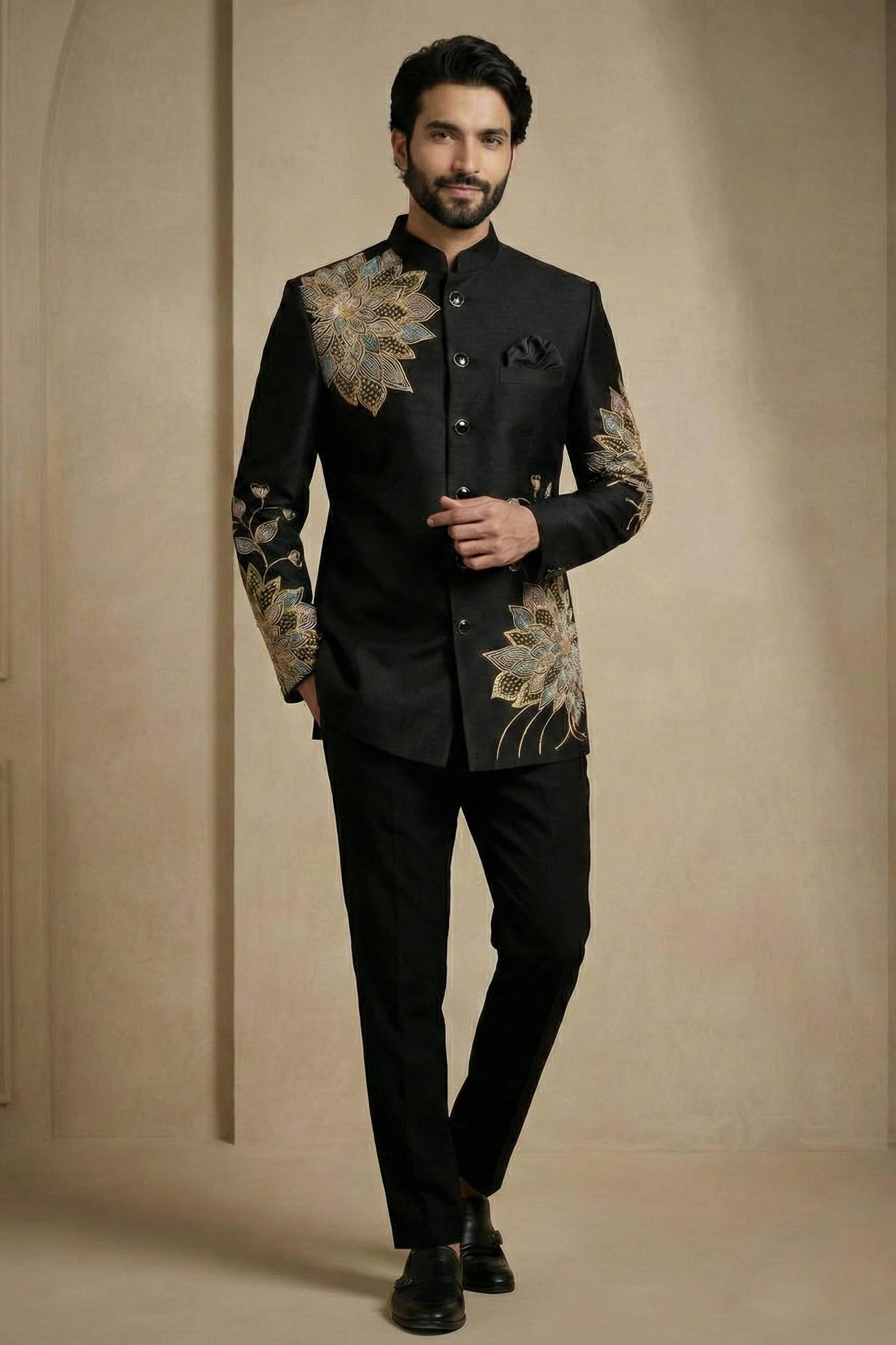 Satin Silk Embroidered Black Readymade Jodhpuri Suit For Men