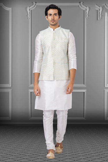 White Engaging Dhupion Raw Silk Fabric Festive Wear Readymade Kurta Pyjama For Men With Jacket