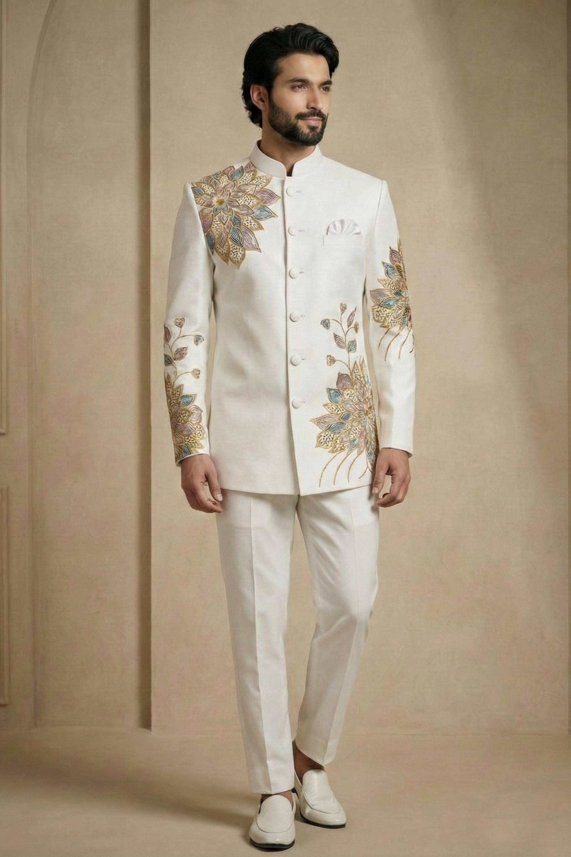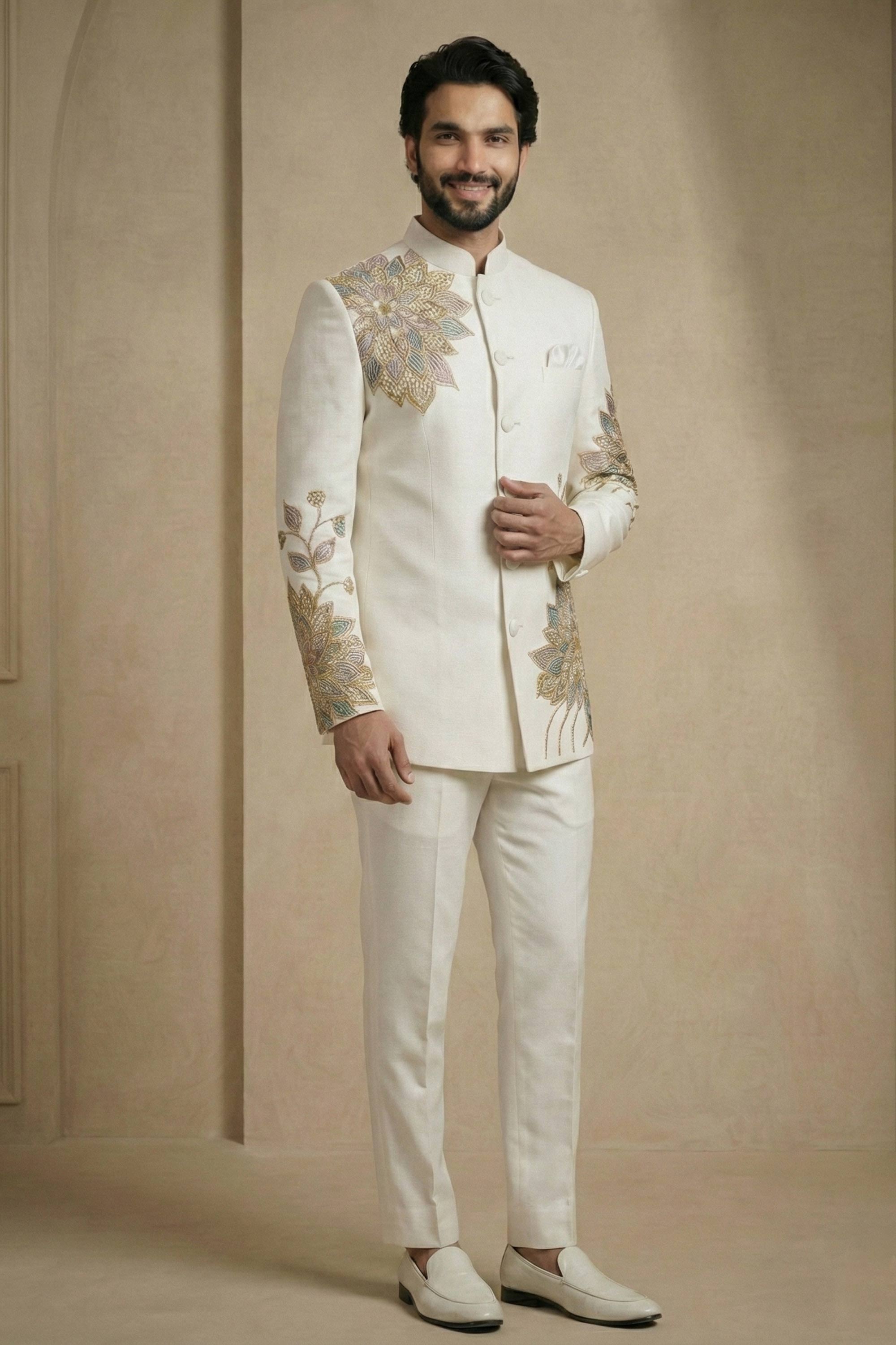White Sangeet Wear Satin Silk Fabric Readymade Jodhpuri Suit For Men