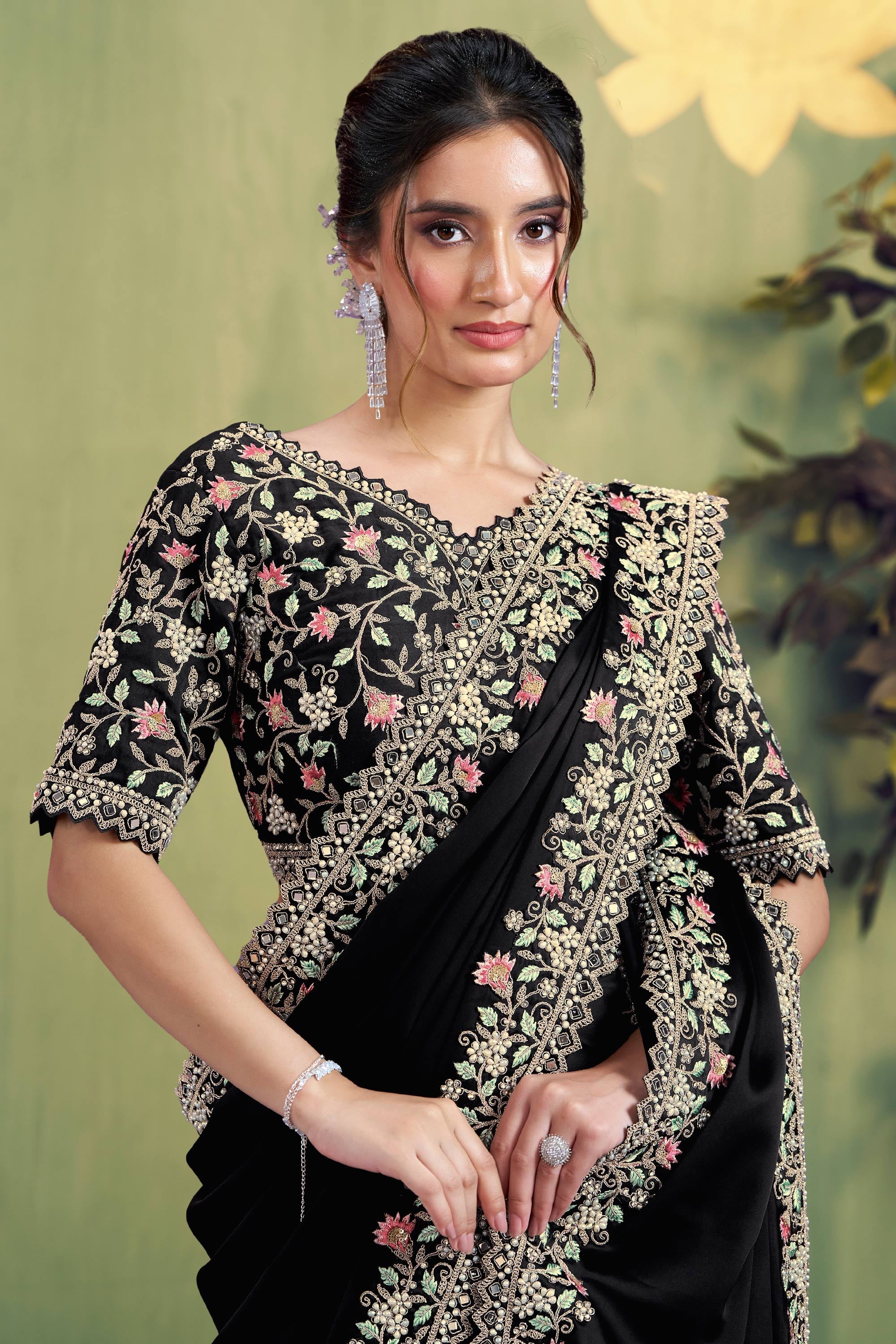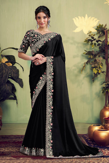 Black Wedding Wear Satin Silk Border Work saree
