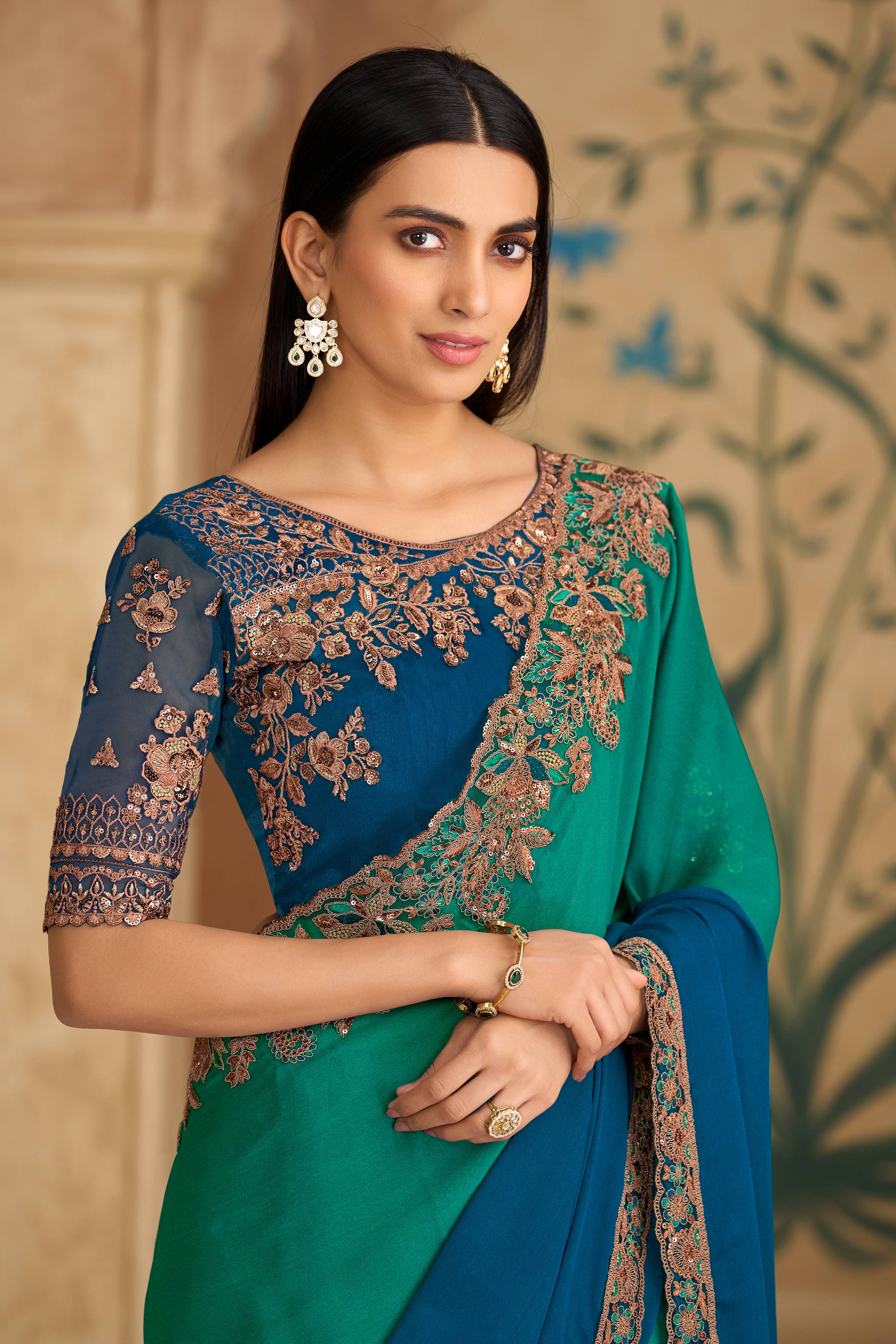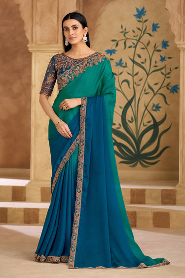 Chiffon Lace Border Work Teal Festive Wear Designer Saree
