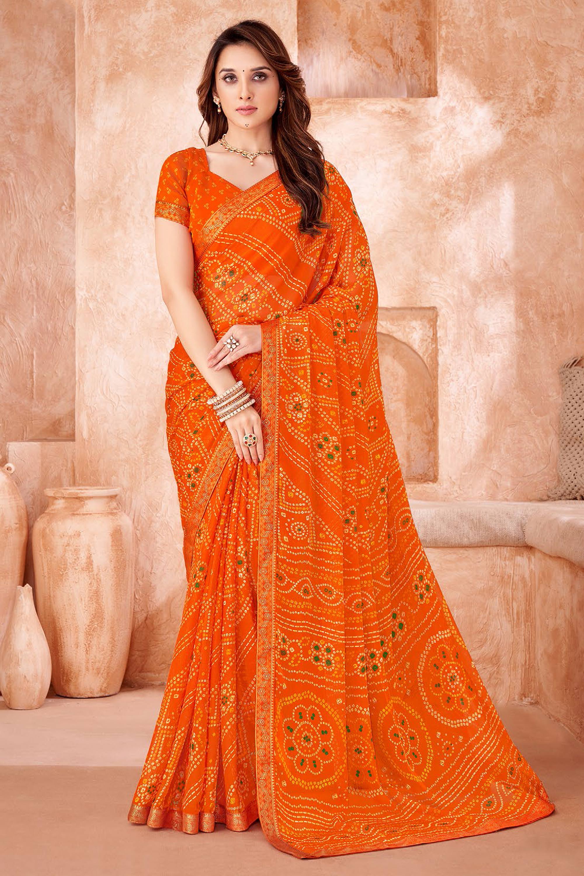 Enhance your everyday look with this vibrant Bandhej Print Chiffon Saree that comes paired with a matching blouse piece. The soft and lightweight chiffon fabric offers effortless elegance and all-day comfort. Perfect for casual or semi-formal occasions, the Bandhej print celebrates cultural heritage in a simple yet stylish way. This saree’s airy texture makes it ideal for hot weather, allowing you to stay cool and look radiant wherever you go.