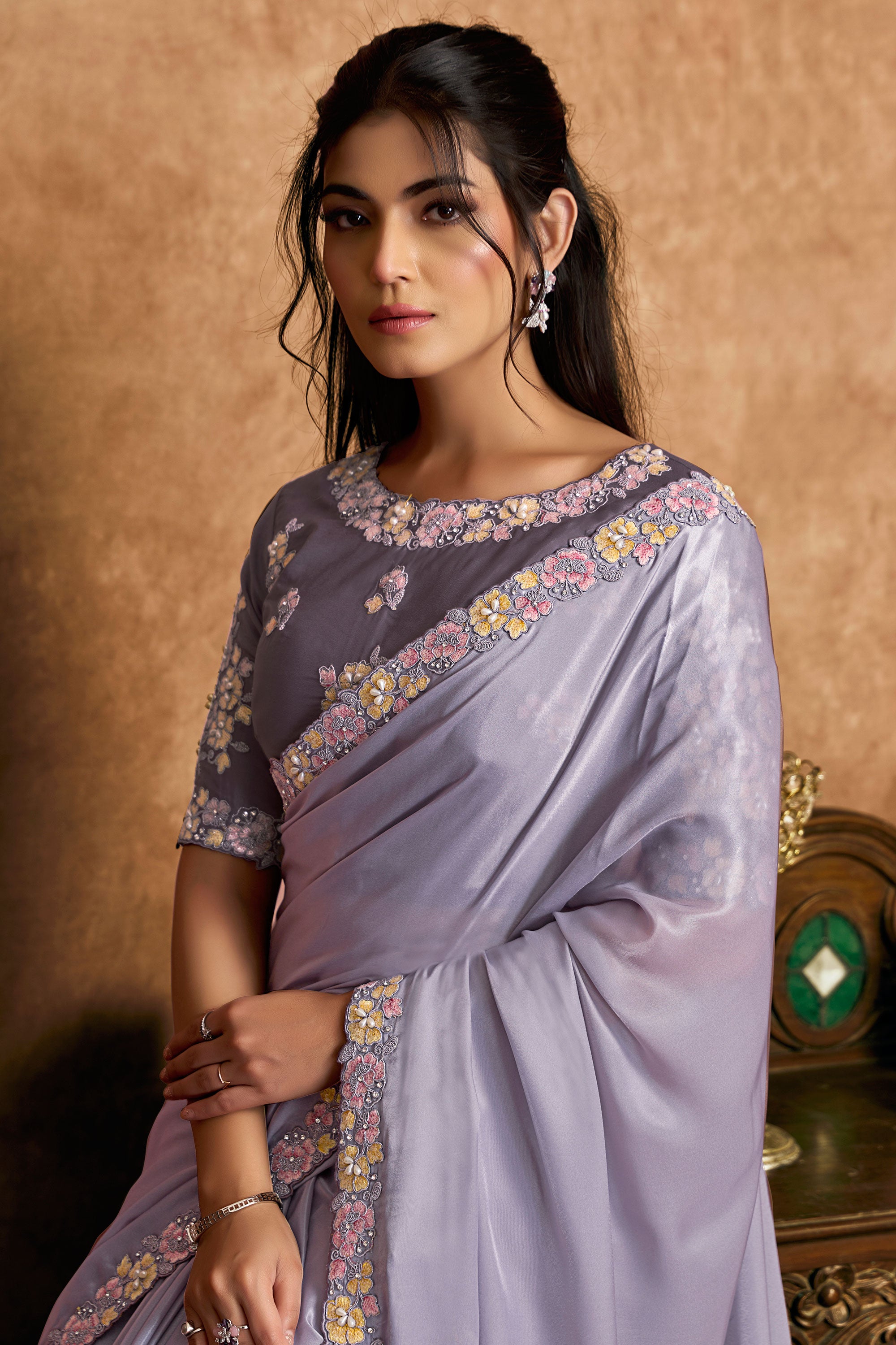 Crepe Satin Traditional Lavender Border Work Festive Wear Saree With Unstitched Blouse
